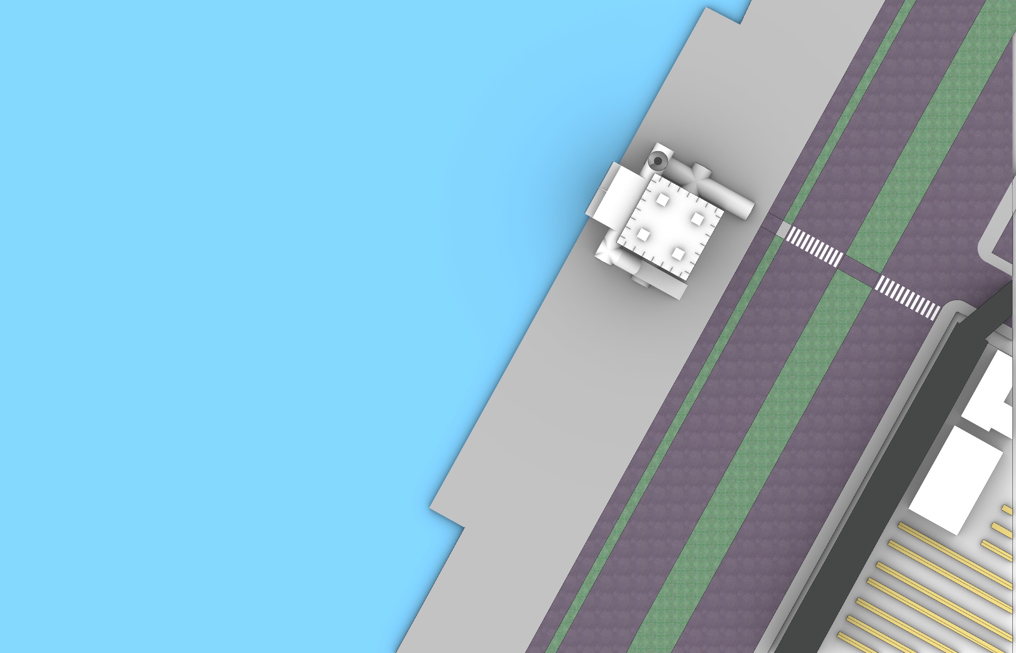 do not change any existing geometry create an architectural plan drawing of the site around my building the blue color that is on the left hand side of the image is meant to be water in the form a river the building is the white square with the white rectangles around it do not change the building in any way place a small parking lot above the white building do not put parking anywhere other than above the white building add any landscaping to make the parking lot look appealing the purple material is meant to be the asphalt of the existing street do not change the shape of the existing street the green areas are medians in between the road where there needs to be some trees and other plants the remaining central gray portion needs to be turned into a cool park with an outdoor classroom the yellow shapes in the bottom right corner need to be train tracks and perpendicular to the street