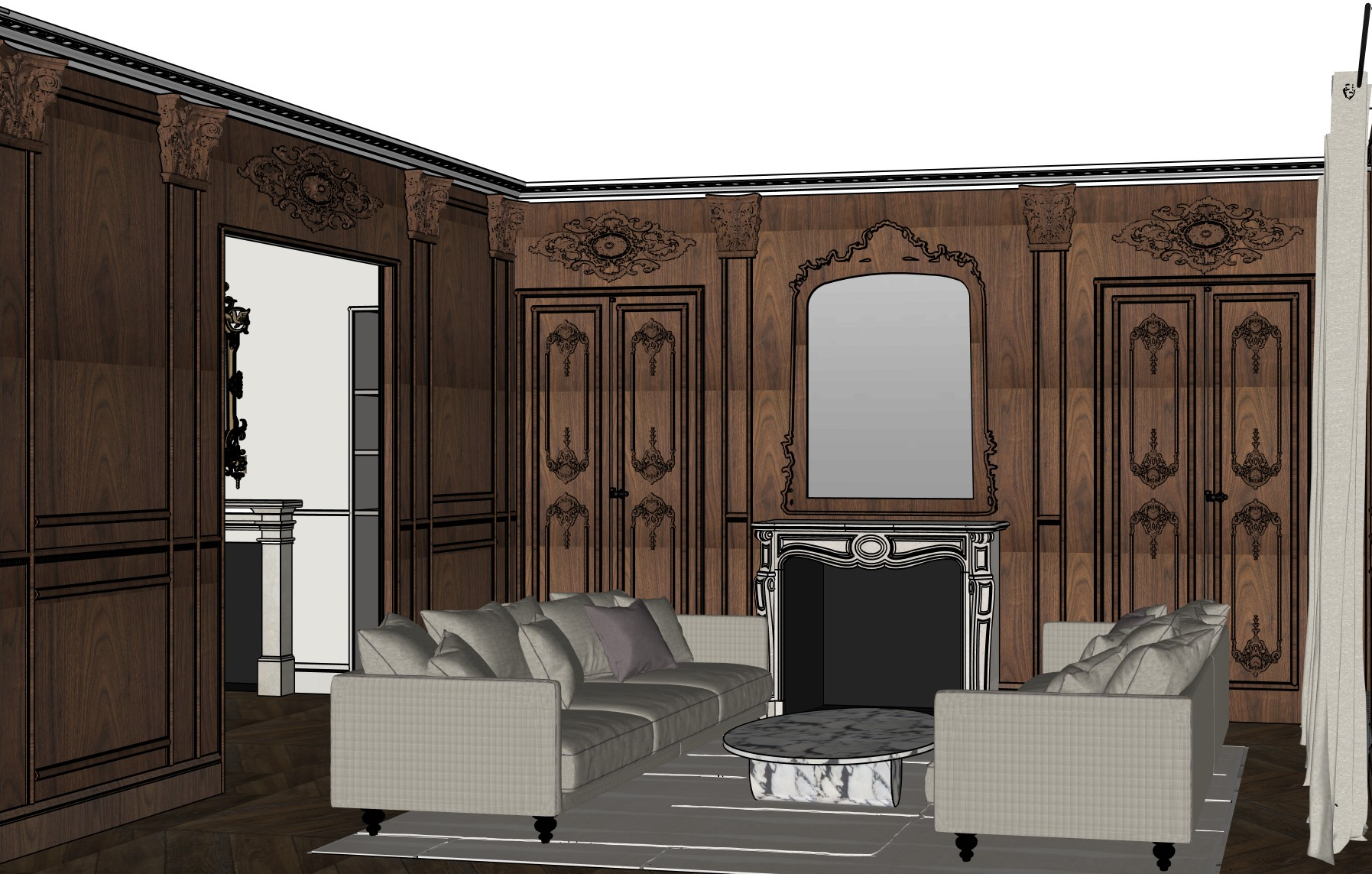 the apartment is located in a parisian building on the 3rd floor the wood of the millwork of the walls is walnut the sofa is this one and should be in taupe velvet https www laredoute fr ppdp prod 500807014 aspx dim1 1004 dim2 1000 docid 00000000000001 cod bps00081461fr gad source 1 gad campaignid 23078571328 gbraid 0aaaaadykrsq2wb cqzmtrejqq qowwd37 gclid cjwkcajwwjzpbhbreiwajfhrnefmhkxyjvvsckfhdmpm56lxbpyvmmymwweesn2su2teqz5ql18krrocgfcqavd bwe