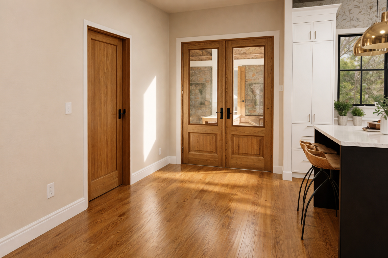 change door on far left to a pocket door door slides open to the left lighten wood floor tone a little