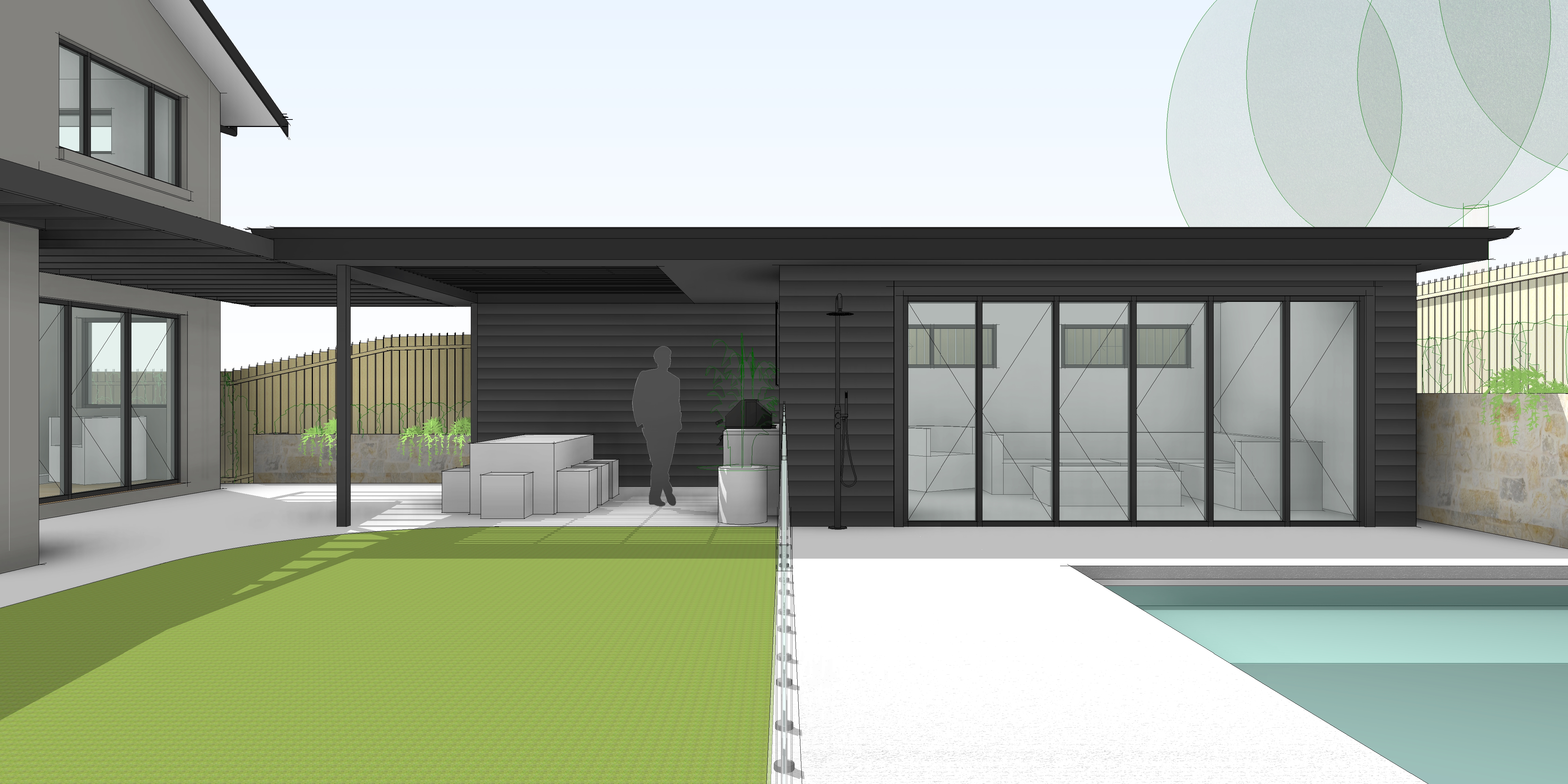 render a photorealistic 3d perspective of this house near sydney reference the current material style and enhance them black metal roof linea fibre cement cladding and sandstone walls keep model geometry the same windows doors roof walls garage door pavement driveway make a lush vegetation that looks native to australia do not change the view only enhance the current materials and make the landscape nicer vegetation detailed textures in the grass and glass reflections and a vibrant clear sky with light atmospheric depth render in hyper realistic architectural visualization quality 8k resolution