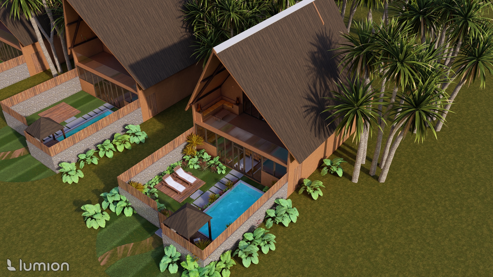 i need the buildings of this render to remain accurate but to adopt the painting style and color tones of the reference image this renders needs to feel like it is in tanzania island tropical but still africa safari style