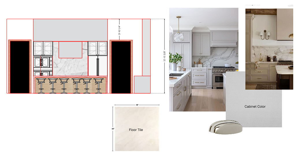 render a modern kitchen with a light and airy atmosphere the cabinets are a soft gray color paired with elegant brushed nickel handles the countertops and backsplash are made of white marble with subtle gray veins the doorway trim in in a light oak the flooring is light tile 48 x48 creating a warm and welcoming environment the kitchen island features a integrated sink comfortable stylish bar stools with metal accents placed under minimalist pendant lights the overall color palette is neutral and calming with soft whites grays and natural wood tones illuminated by soft ambient lighting for a contemporary cozy vibe