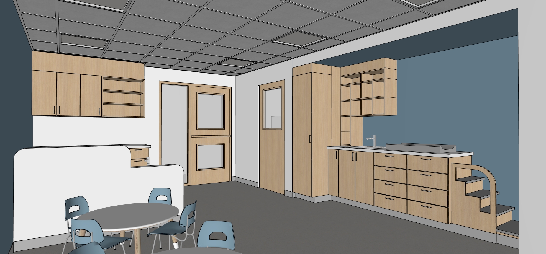 architectural interior render of a childcare center cpe based strictly on the provided sketchup image do not add remove or modify any architectural elements furniture openings or layout keep all objects proportions and positions exactly as modeled all existing ceiling light fixtures must be turned on and emit soft realistic illumination combine artificial lighting with natural light if present keeping a balanced and believable exposure preserve the original colors and materials but enhance them with realistic textures accurate material properties and subtle imperfections moderate wood grain fabric softness matte finishes child friendly clean calm and warm atmosphere suitable for a cpe environment realistic global illumination soft shadows correct scale neutral camera perspective no dramatic effects no stylization semi realistic architectural visualization professional quality natural color grading no new furniture no extra decor no change in layout no change in wall positions no change in ceiling design no exaggerated lighting no cinematic effects moderate cartoon look do not change the light fixture do not change the walls color colors and saturation must be more like source image