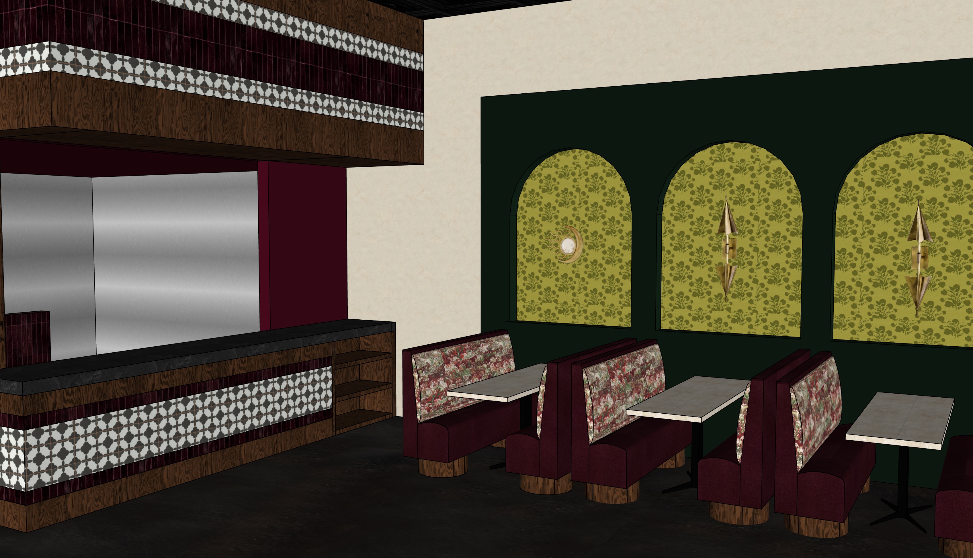 transform the provided restaurant interior image into a high end photorealistic render with warm golden hour atmosphere soft glowing highlights and relaxed upscale energy while keeping everything exactly the same same proportions same bar shape same booth seating same alignment lighting should emphasize golden hour warmth gentle reflections soft shadows enhanced color richness and luxurious catalog level realism improve depth and realism through wood grain richness marble shine brass highlights fabric texture and polished clarity while keeping the entire scene exactly as originally designed there is new stainless kitchen equipment in the kitchen and the green on the wall is a deep rich green there is overhead lighting perfectly illuminating the space while keeping all tables and chairs in their exact positions include modern young guests seated at the booths casually social correctly scaled tastefully integrated without crowding or obstructing architectural details drinking from crystal clear wine glasses and enjoying the food and beautiful atmosphere the image is high definition and magazine quality there is a warm led light glowing around the perimeter of the arches and behind the wall adding to the ambiance