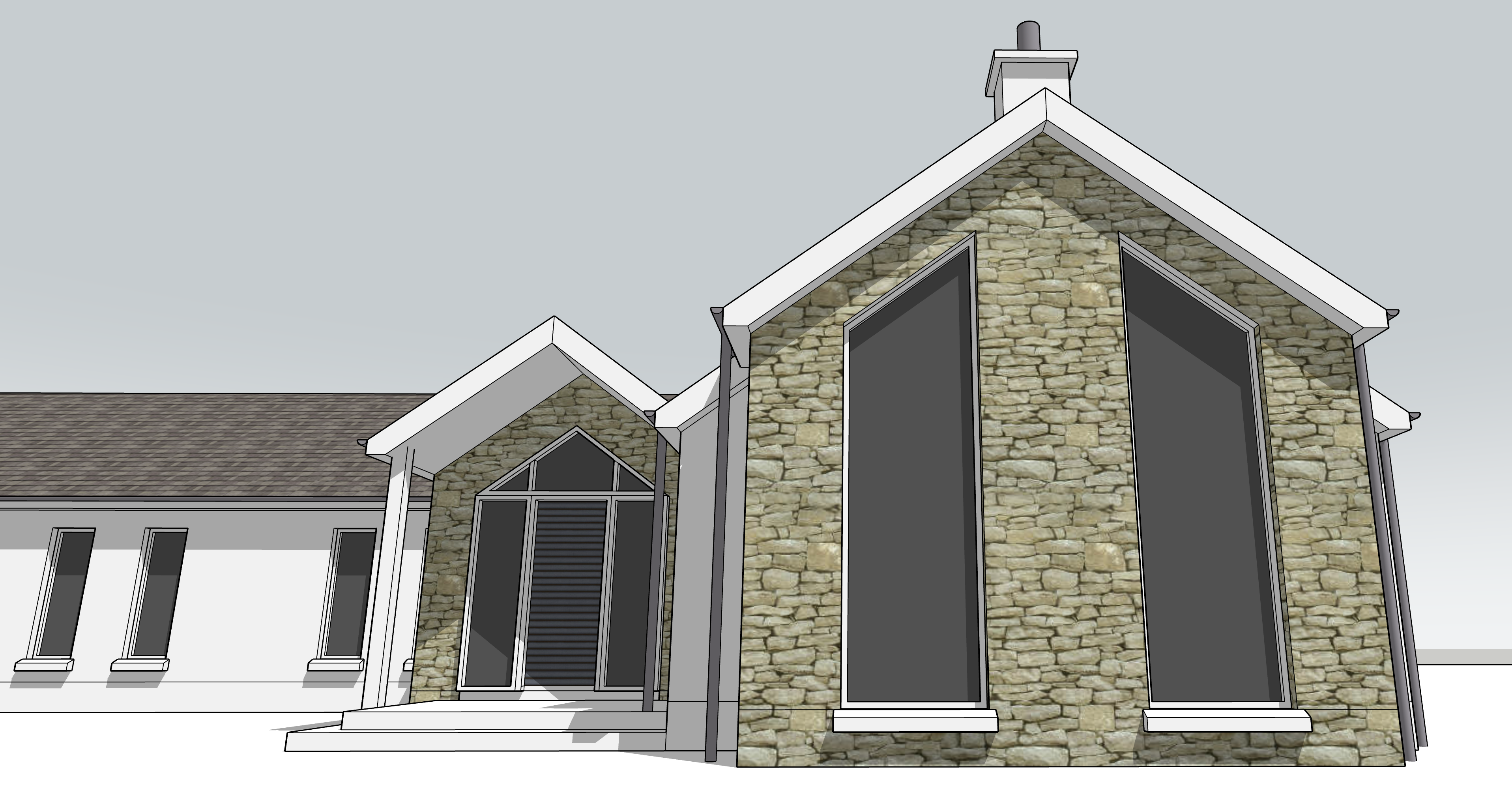 building to be finished in bright white render where shown white and natural stone where walls are shown in stone on the left and right hand side outshots including the rear chimney show a driveway to the left hand side and views in the background of mature trees and hedging behind the building and some low lying cloud add black downpipes and gutters the tarmac driveway in the foreground should have some natural flower beds between it and the house the image should display a midday scene make the image ultra photorealistic also make the post supporting the roof at the front door out of cedar on the left side of the front door do not include a post on the right side of the front door don t cut the house off on the left side as it extends further than the image shows include sandstone steps and a driveway coming in from the right side of the image include anthracite grey door and window frames throughout keep this camera perspective looking from a low level just in front of the house