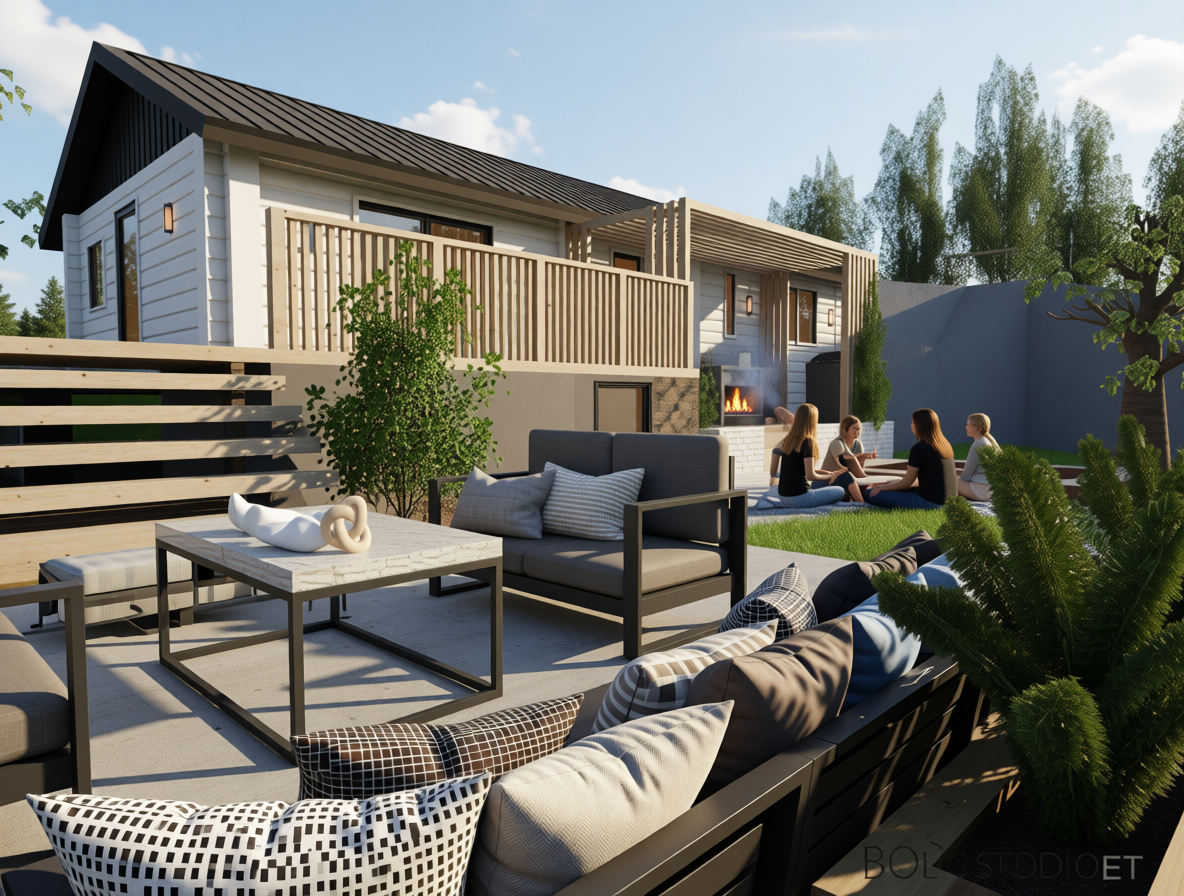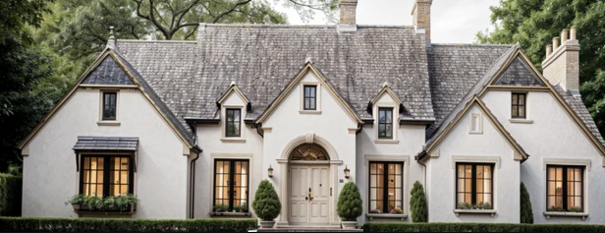 exterior shot render a beautiful architectural visualization of a modern elegant house with a classic symmetrical design use soft beige for the brick walls and a dark charcoal grey for the roof shingles highlight the windows with white frames to create contrast set the scene in a calm twilight atmosphere with a gentle glow from warm toned lights illuminating the exterior add lush greenery around the house featuring deep green grass and a few slender trees the sky should be a gradient of soft purples and pinks to enhance the serene and inviting ambiance