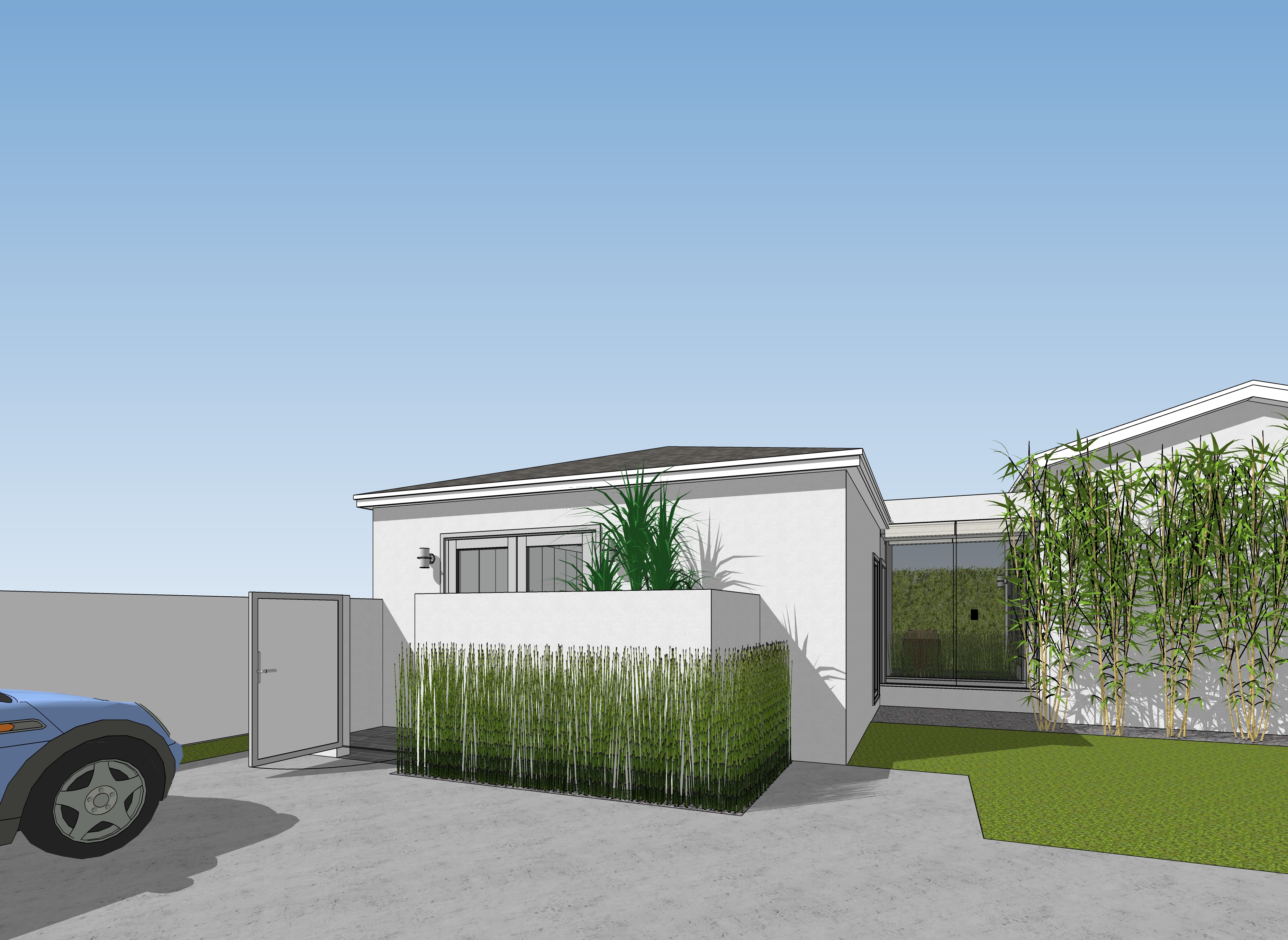add trees on the other side of the wall at the left side of the view make the driveway look like decomposed granite add some california wild flowers to the yard late afternoon sunshine with some clouds in the sky add a woman walking through the gate into the house