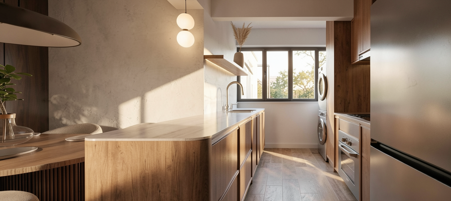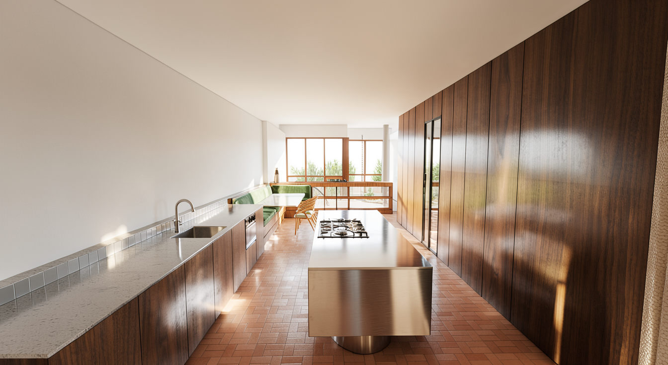 make kitchen island from stainless steel and make floor of terrazzo and kitchen on left side change wood in to stainless steel