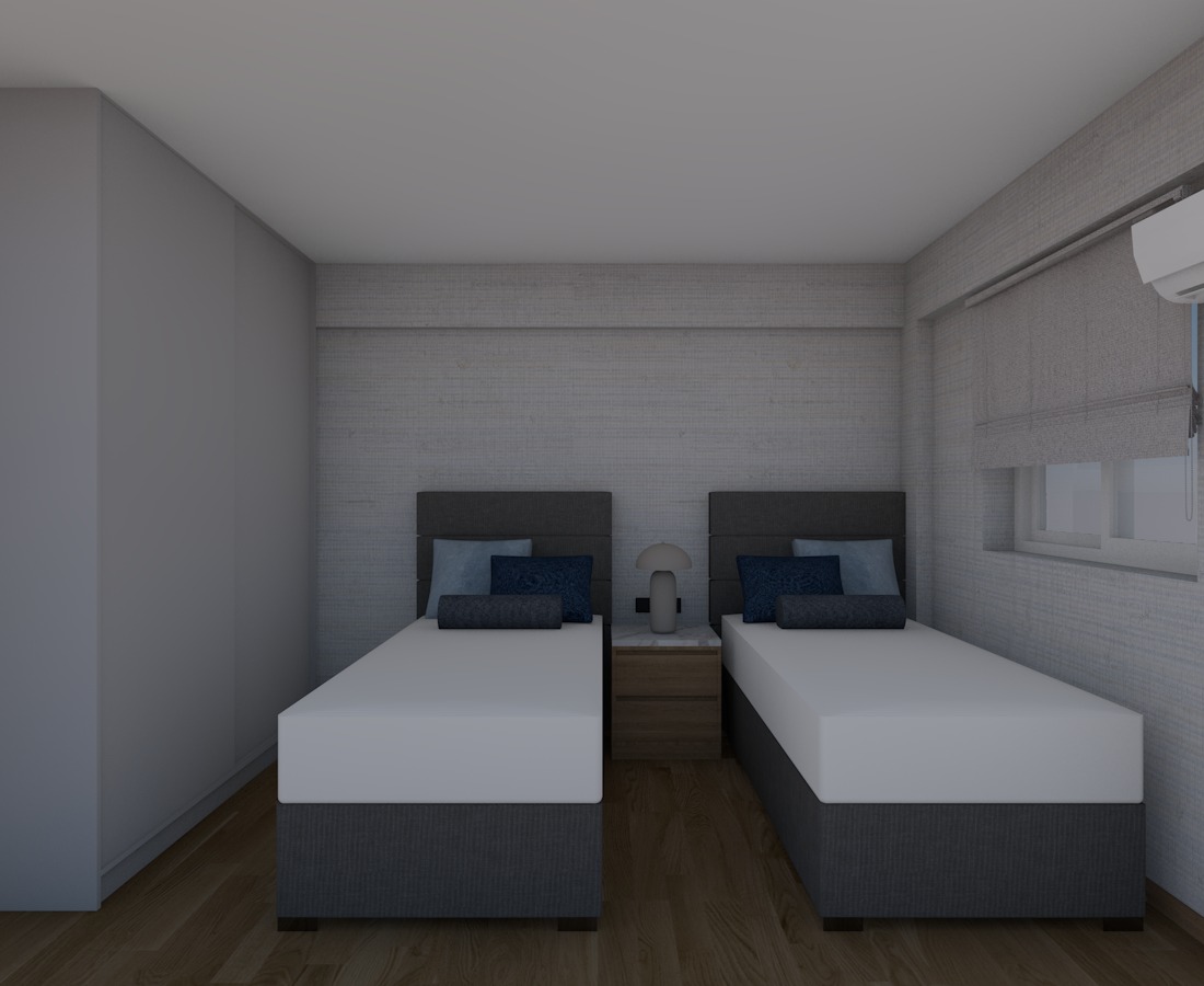 beds side view the fabrics of the beds is perfectly ironeded with nice pillows in the colors of the picture each bed has the some colors of the pillows the lamb in the nightstand is metal mat ceramic beige tone