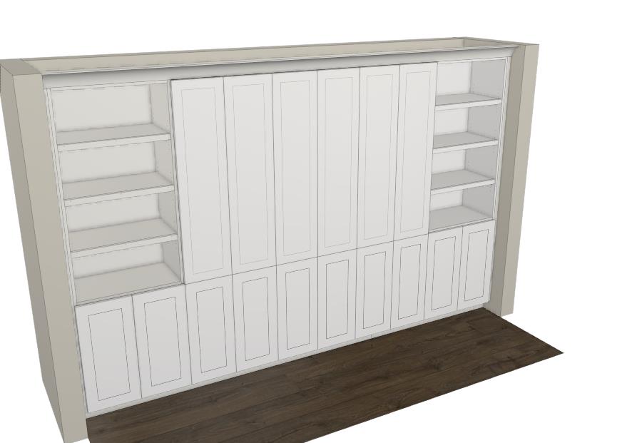 please make the open cabinets on the sides with walnut interiors place a few decorative items on the shelves