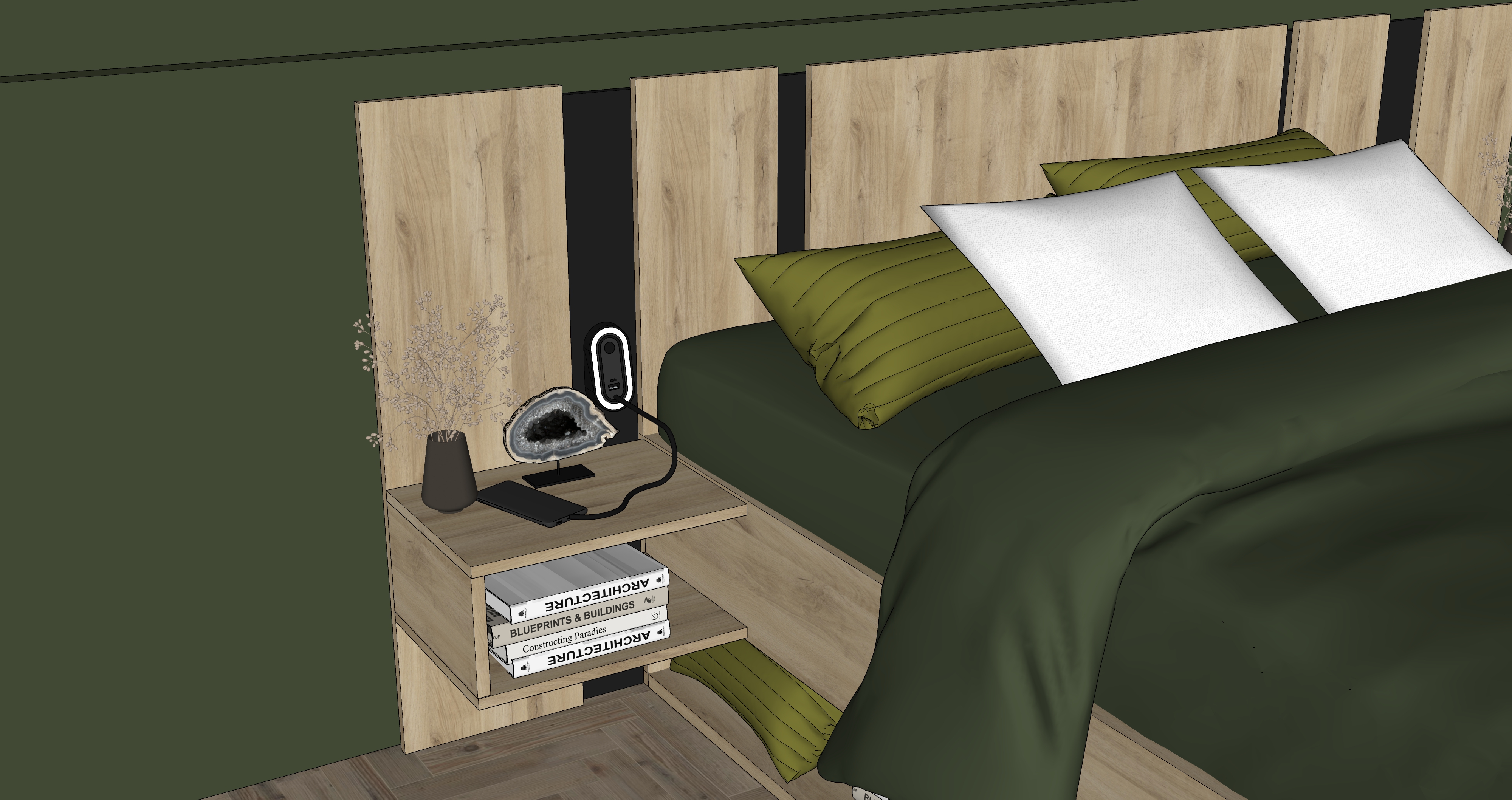chambre moderne et chaleureuse au design naturel grand lit avec drap beige couvertures vert fonc et coussins assortis mur d coratif vert textur plantes tombantes fix es en hauteur suspensions avec ampoules vintage en verre sol en bois clair grand tapis gris chaussures dans les niches basses du lit ambiance cosy style contemporain et minimaliste rendu photor aliste haute r solution