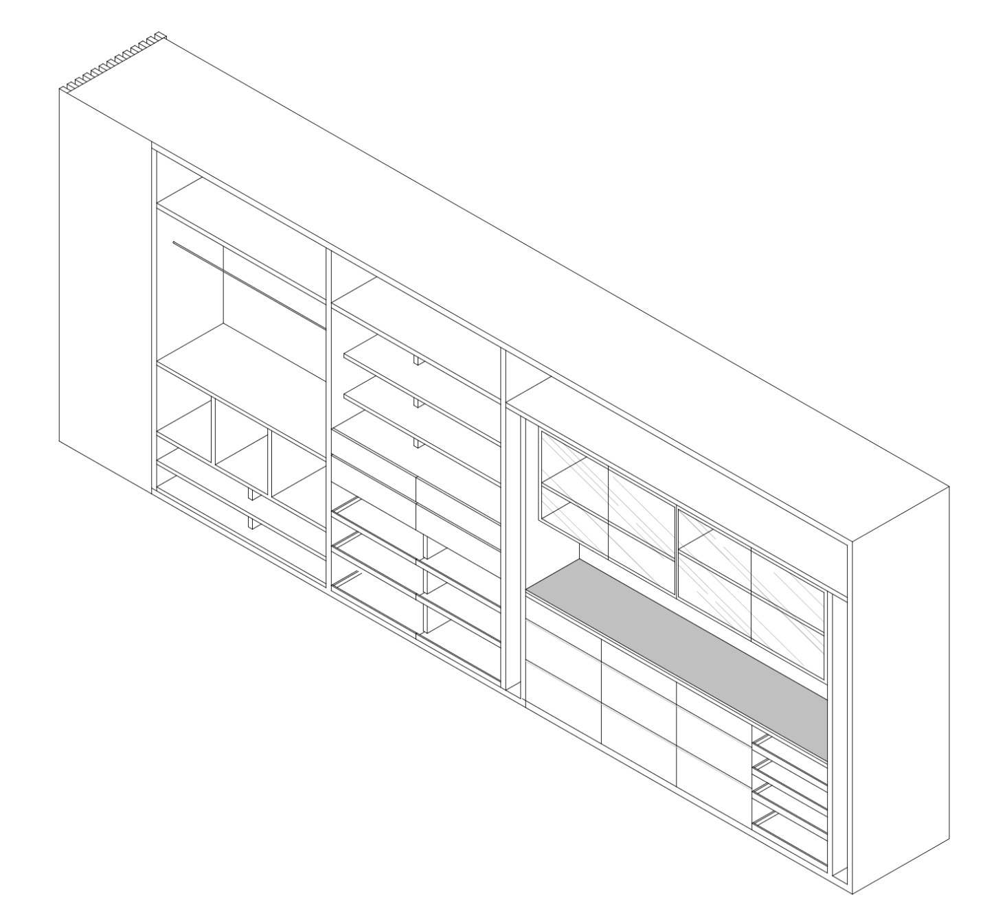 multifunctional furniture where the right module is the bar consisting of drawers with a gap functioning as a handle upper cabinets with 4 doors featuring very thin black aluminum perimeter profiles with smoked glass in the center inside hanging glasses cups and liquor bottles can be seen the countertop is matte black on the shelves next to the drawers snack jars or bags will be visible the center module is for storing dishes bowls cutlery and other kitchen and dining accessories the drawers also have a gap functioning as a handle the left module is the guest closet so the thin upper rod will show hanging clothes the lower cubes for storing bags and the bottom ones for shoes the entire furniture will be in a dark anthracite gray realistic render