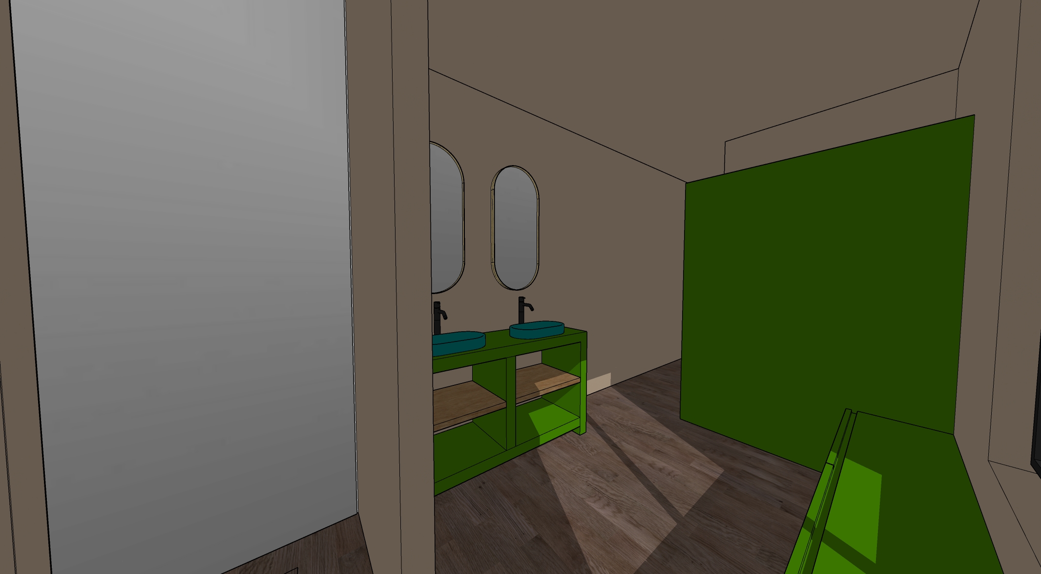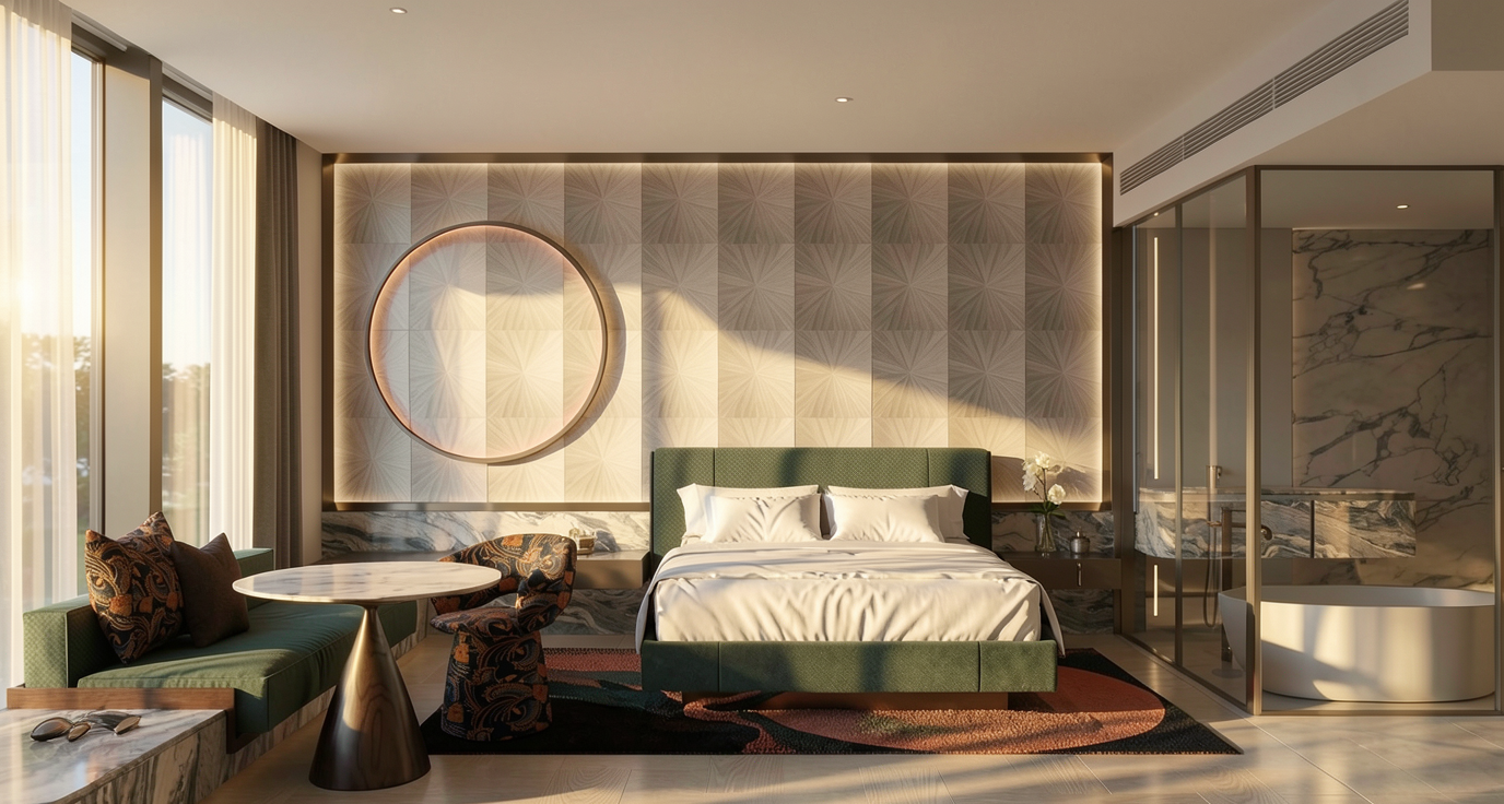 i want a photorealistic render in the style of the added images walls need to be a white painted tecture like mortex green color needs to be the same as the style of the image provided add lichting and make it very nice