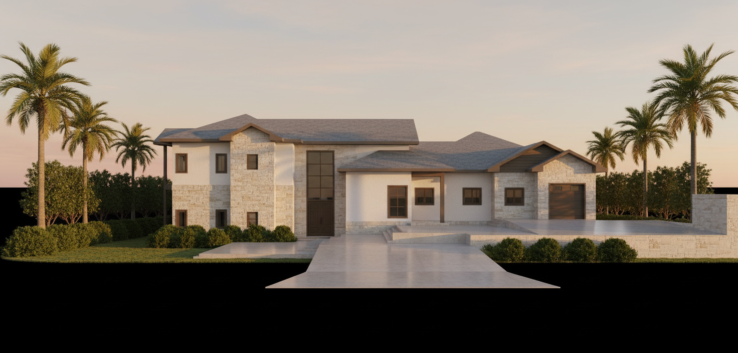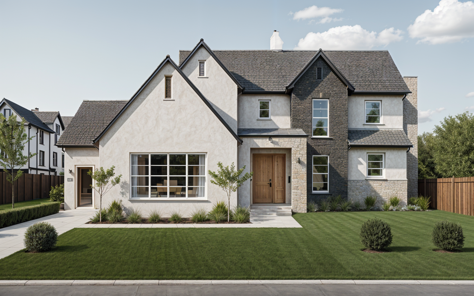modern two story house with large windows and a contemporary design set against a clear blue sky the walls are painted in a soft warm beige complemented by dark gray roofing windows are framed in sleek black the front door is a statement piece in deep mahogany the driveway is a clean polished light gray with elegant stepping stones leading to the entrance surround the house with lush green grass and minimalistic landscaping the atmosphere is serene and inviting bathed in natural sunlight