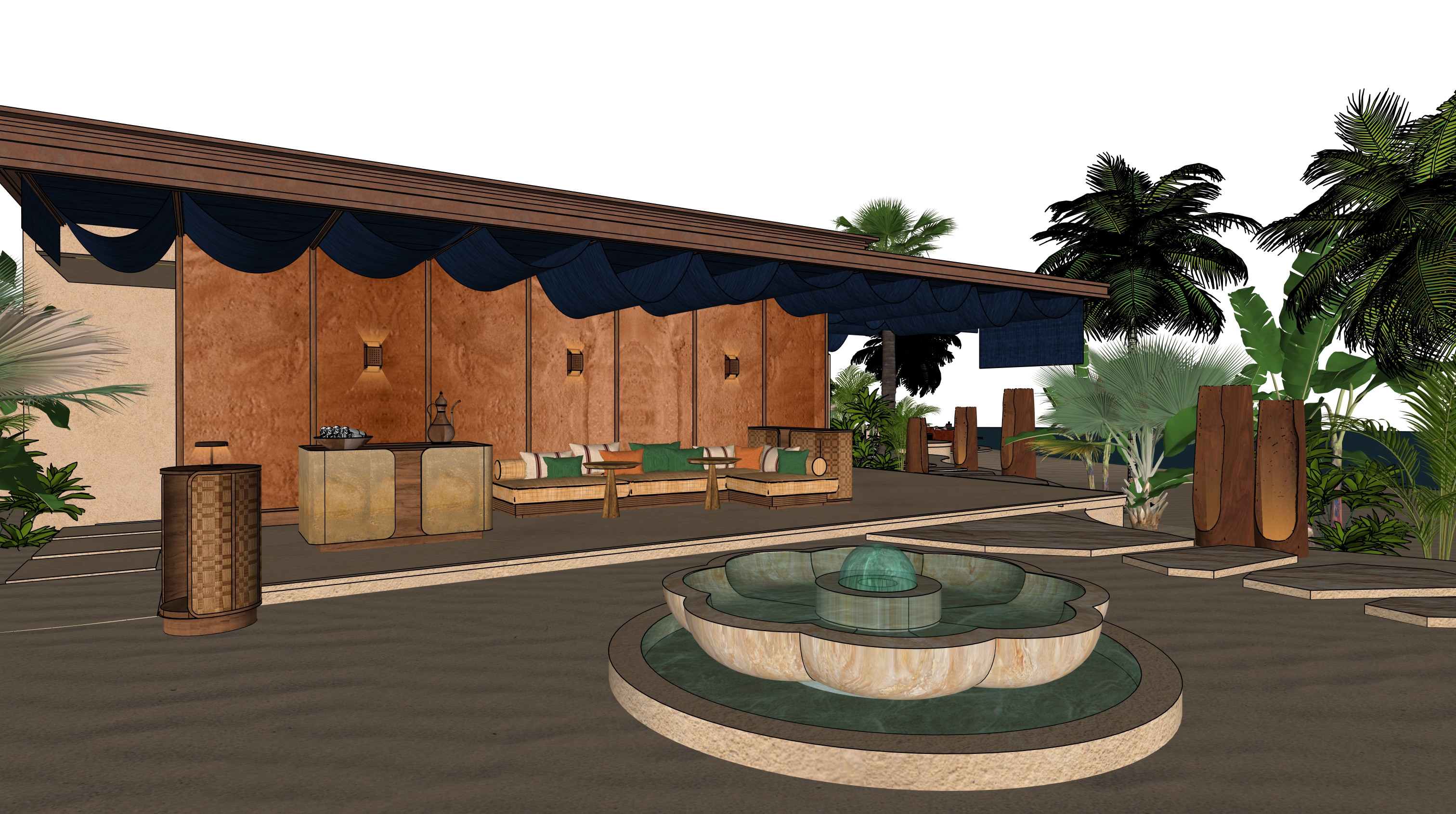 an arrival outdoor lobby with blends of warm sienna deep waney mahogany texture and subtle golden tones the sofa boasts elegant curved lines and moroccan patterns highlighted against a rich matte camel brown plaster backdrop the atmosphere is soft and warm golden hour emphasizing a sense of elegance and timeless beauty the sand to be soft and without weed