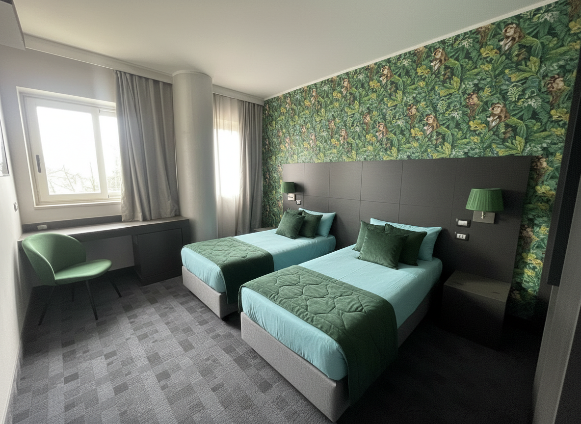 manetta l arredo esistente puoi solocolorare il soffitto il colore delle lenzuola puoi mantenere il tutto con colori e carta da parati ispirata al mare mi puoi dare la migliore versione secondo te puoi variare con i colori del rosa la versione migliore che dici tu mantenendo il pavimento esistente mi puoi fare uno stile ultra moderno classico e raffinato con la finestra