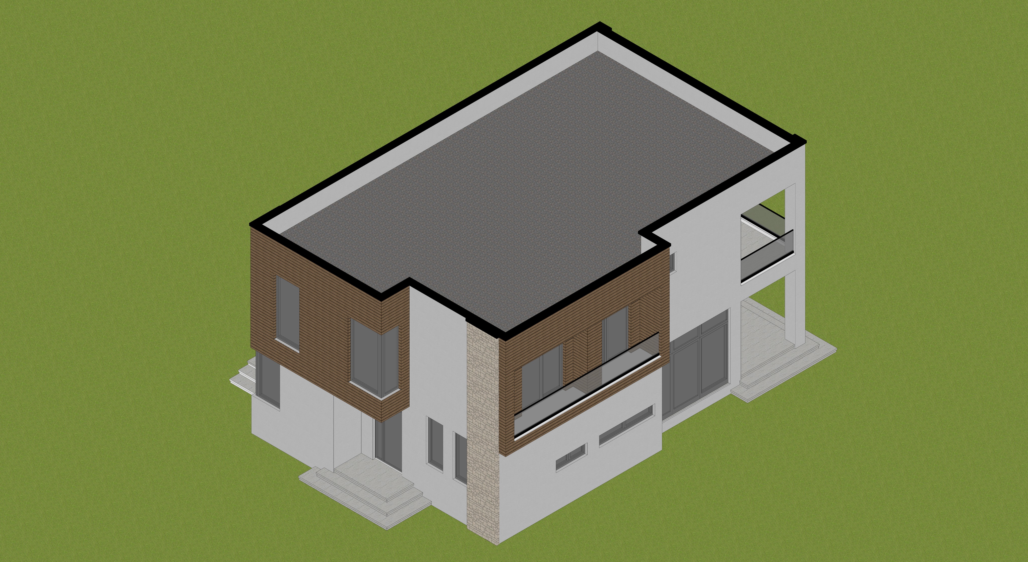 render a modern two story house with a vibrant color scheme the walls are bright coral red with accents of vivid pink and turquoise the balcony features a yellow beam and the roof edges are a deep blue large windows have sleek gray frames and the stairs and base are a crisp white the setting is a serene mint green landscape under a clear blue sky with soft natural lighting enhancing the vivid colors and giving a calm yet lively atmosphere