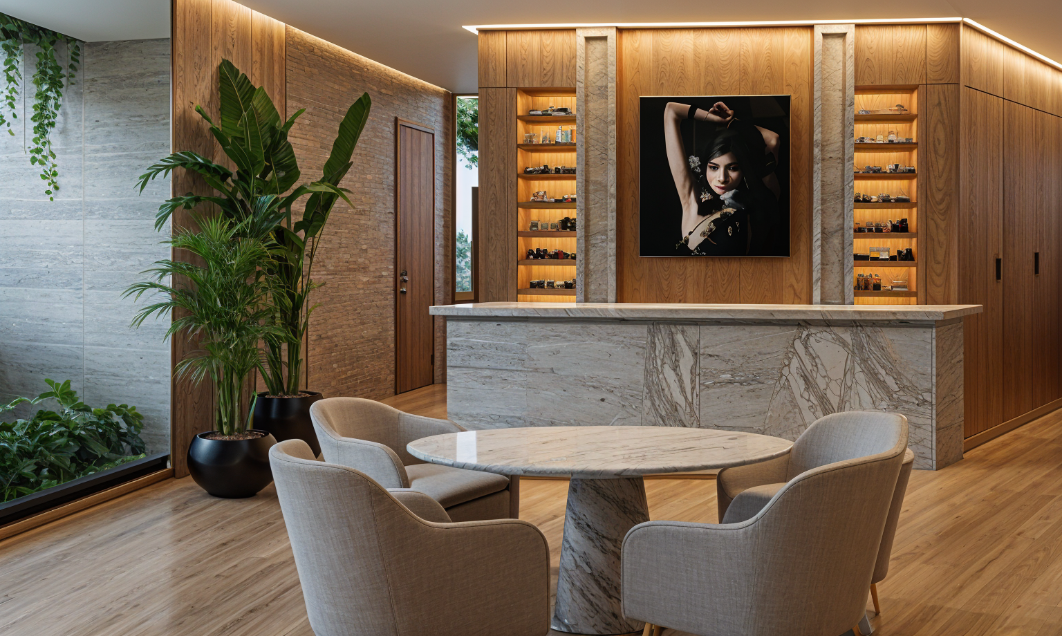 dark granite plint to 4 5m large openings 3 5m high for commercial space four different red tints of corrugated steel to upper facade one per volume change direction of corrugated steel per volume black windows light emitting add people inside and out 4 lane road in foreground red balconies with steel strip balustrade