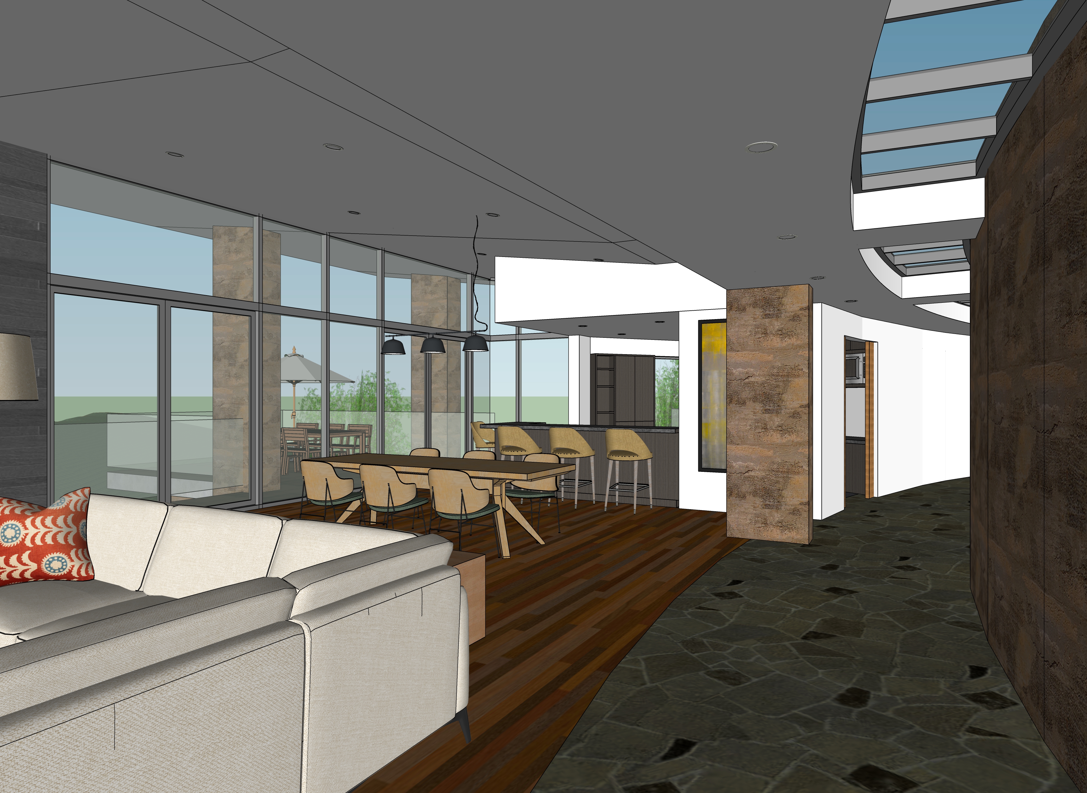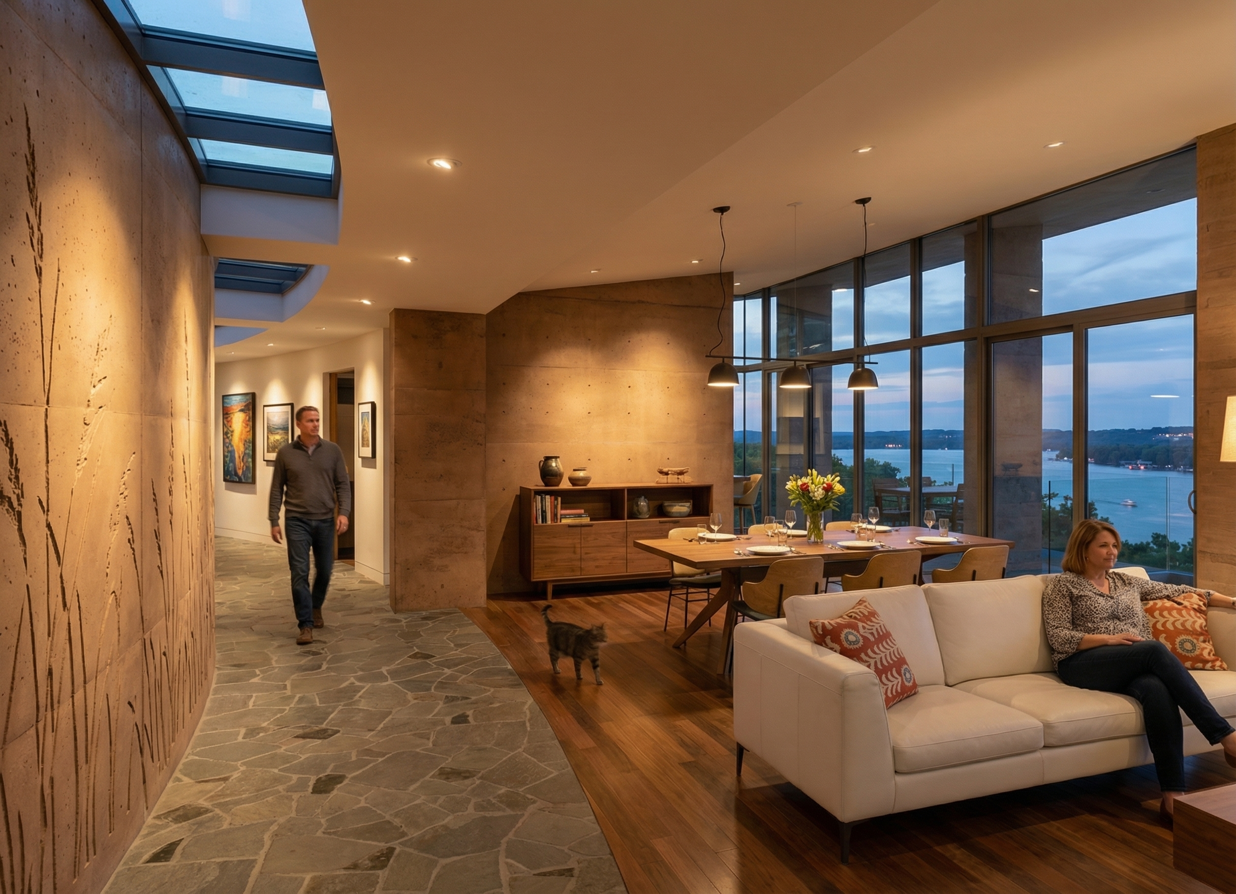 night view with some small lights from boats on the lake add some lights in the far distance coming from houses make the view out of the windows of lake pepin from a high elevation use site cast concrete for the main house material with a natural warm clay color add some abstracted prairie grass patterns in bas relief with a natural warm clay color to the curved site cast concrete wall on the right side of the view cast light on the curved wall at the right side of the view from the recessed lights add table settings and flowers in a vase to the dining room table add a man walking along the curved corridor towards the camera add a woman sitting on the sofa add some accessories on the credenza add light coming from the pendant lights over the dining table add some artwork on the left wall of the corridor add a cat walking through the dining room use the materials in the original view for reference in this rendering hit the painting on the wall to the right side of the bar stool with light
