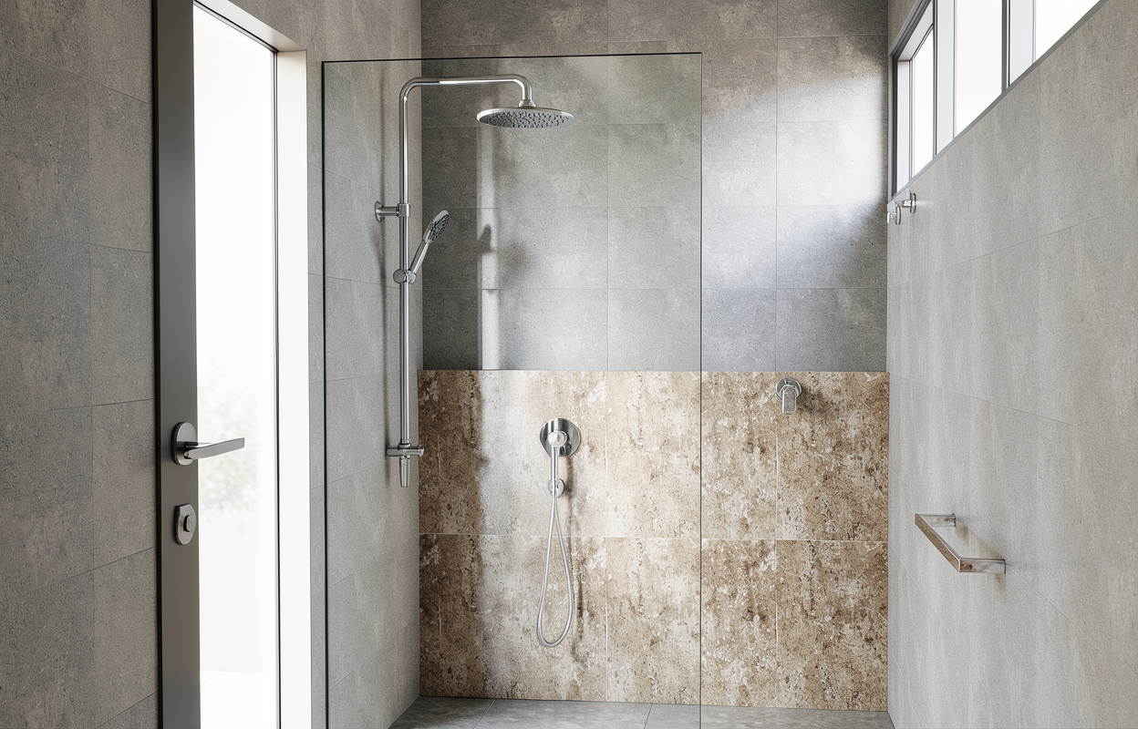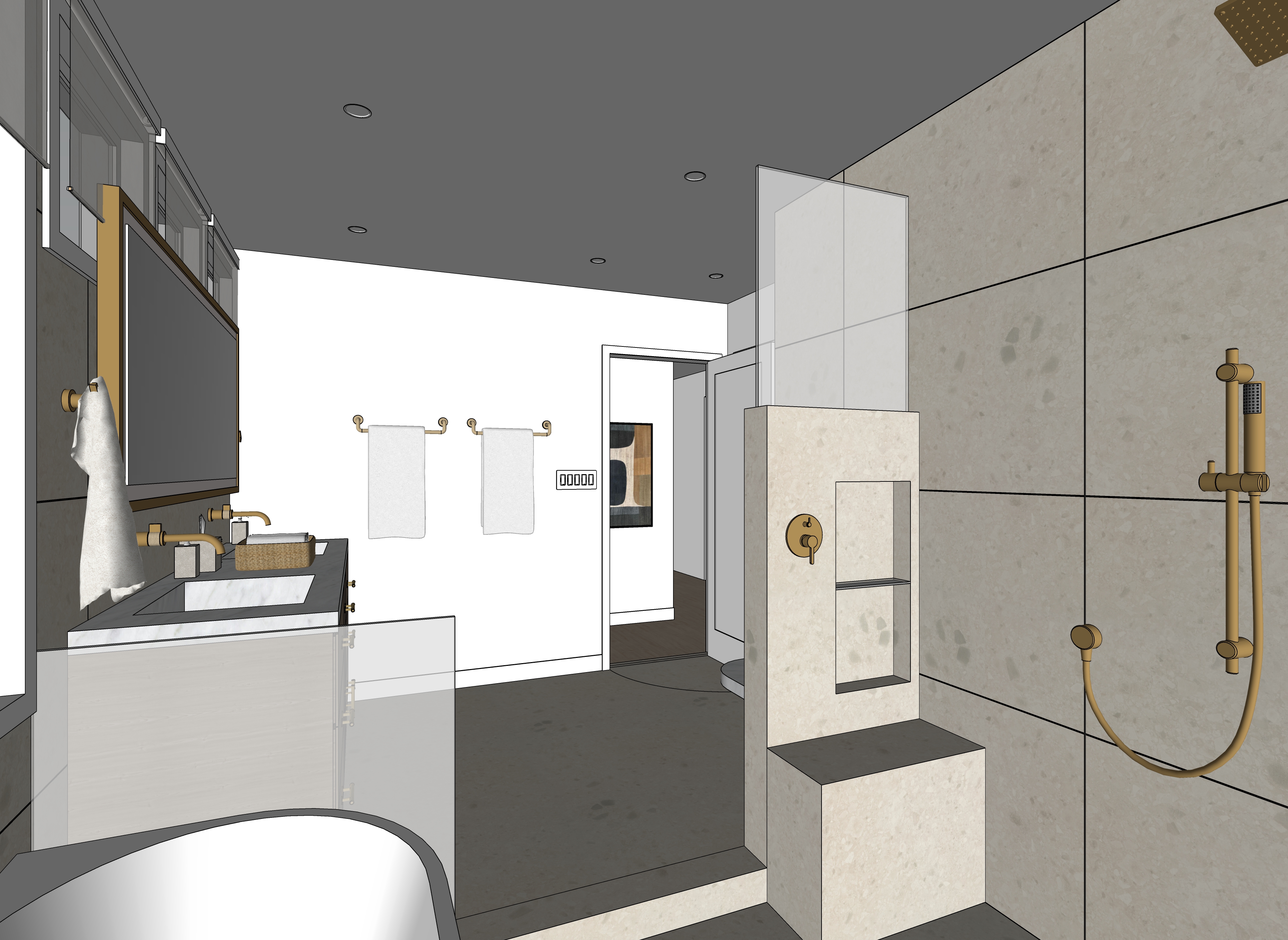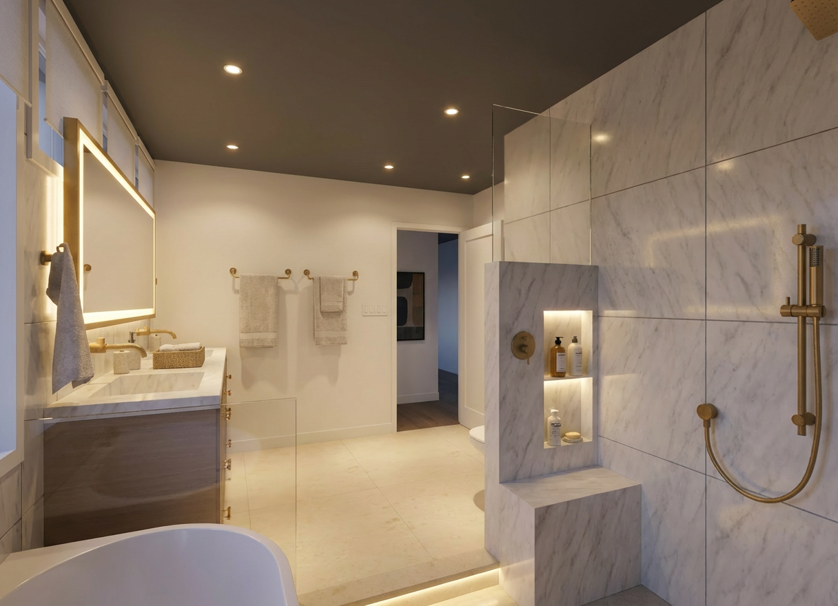 make the lighting evening time add led light on the niches shower and the tub add led lighting around the bathroom mirror add bathroom accessories and towels to the view add light coming from the recessed lights on the ceiling the floor is an ivory colored porcelain tile the ceiling with painted white no led lights at the bench in the shower