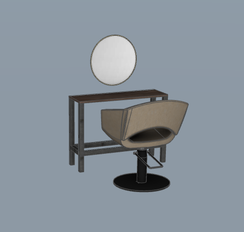 place this steel framed hairdressing styling unit with circular mirror into a busy uk hairdressing salon placed up against a wall which has decorative green plants keep the camera view the same the scale the same