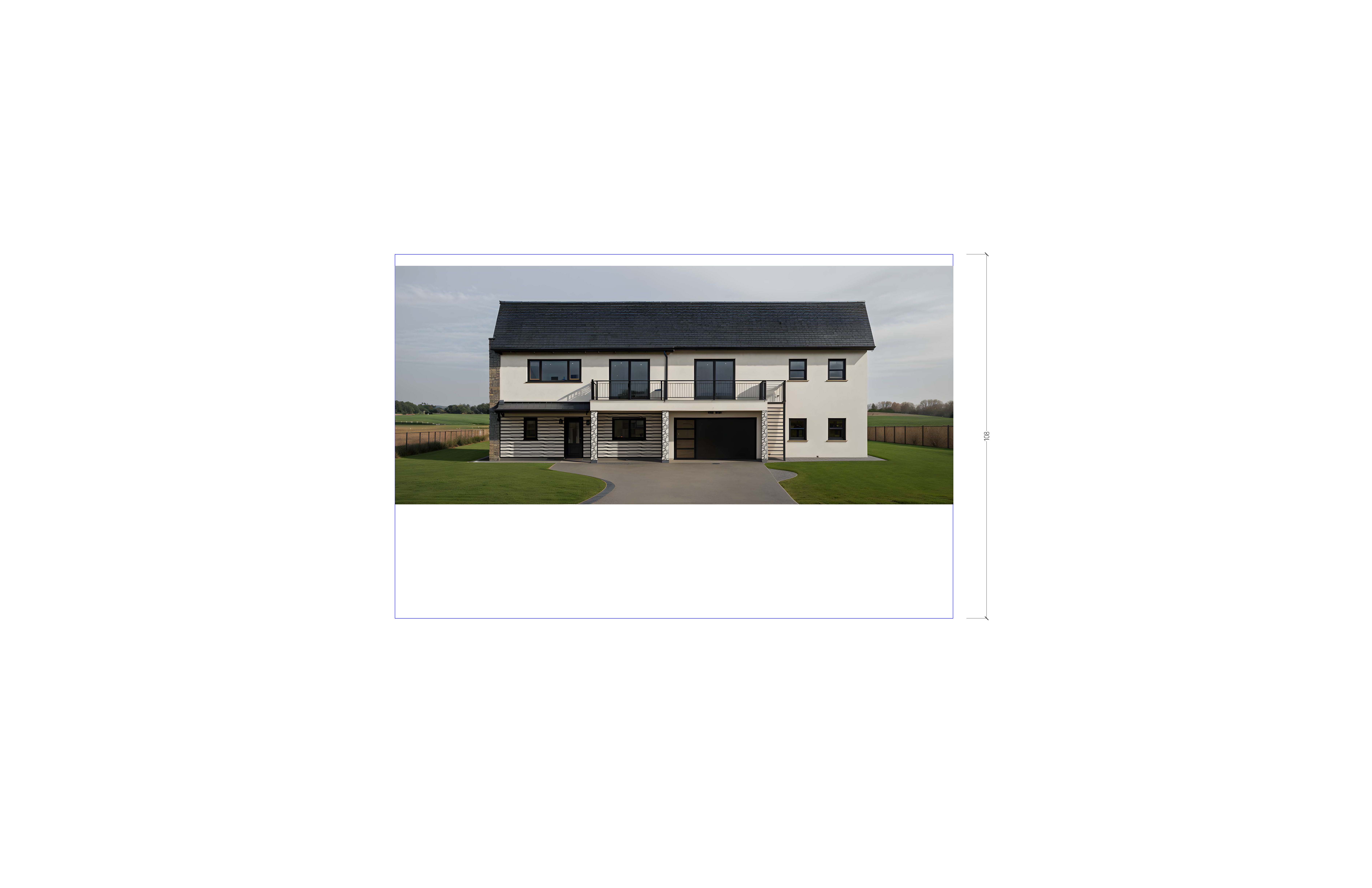 black roof black windows black garage doors with three windows going vertical white smooth stucco walls light color stacked stone accent horizontal wood slats