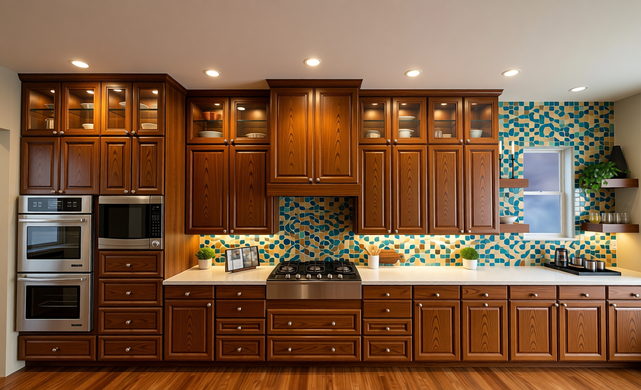 warm wood cabinets with raised paneling and under cabinet lighting in glass cabinets to create a warm and inviting kitchen