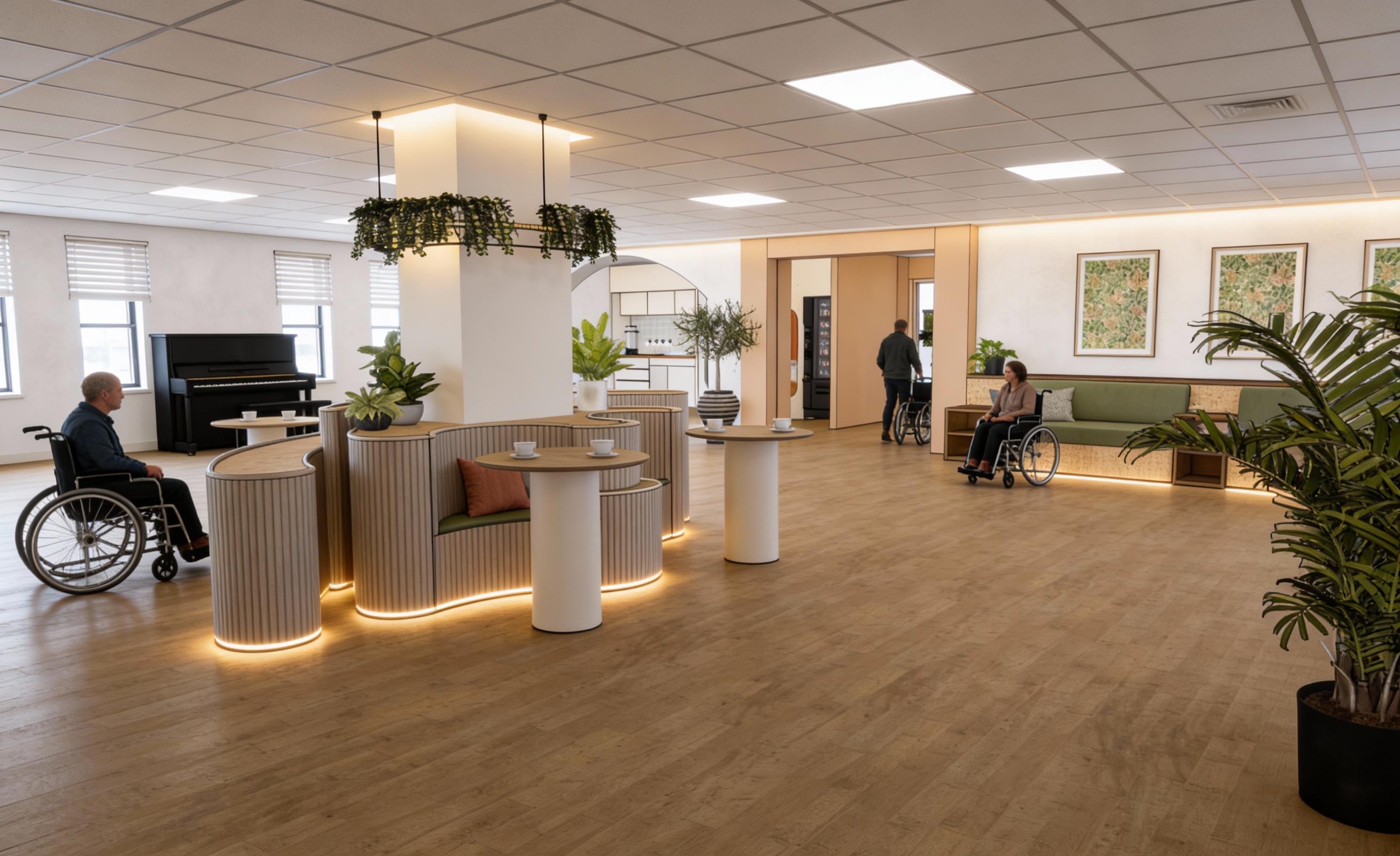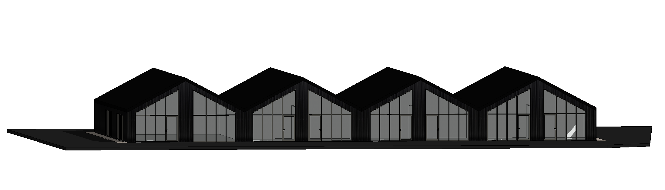 exterior cladding to be aluminum cladding black add planters concrete with greenery in front add furniture inside bakery on left and rest office spaces