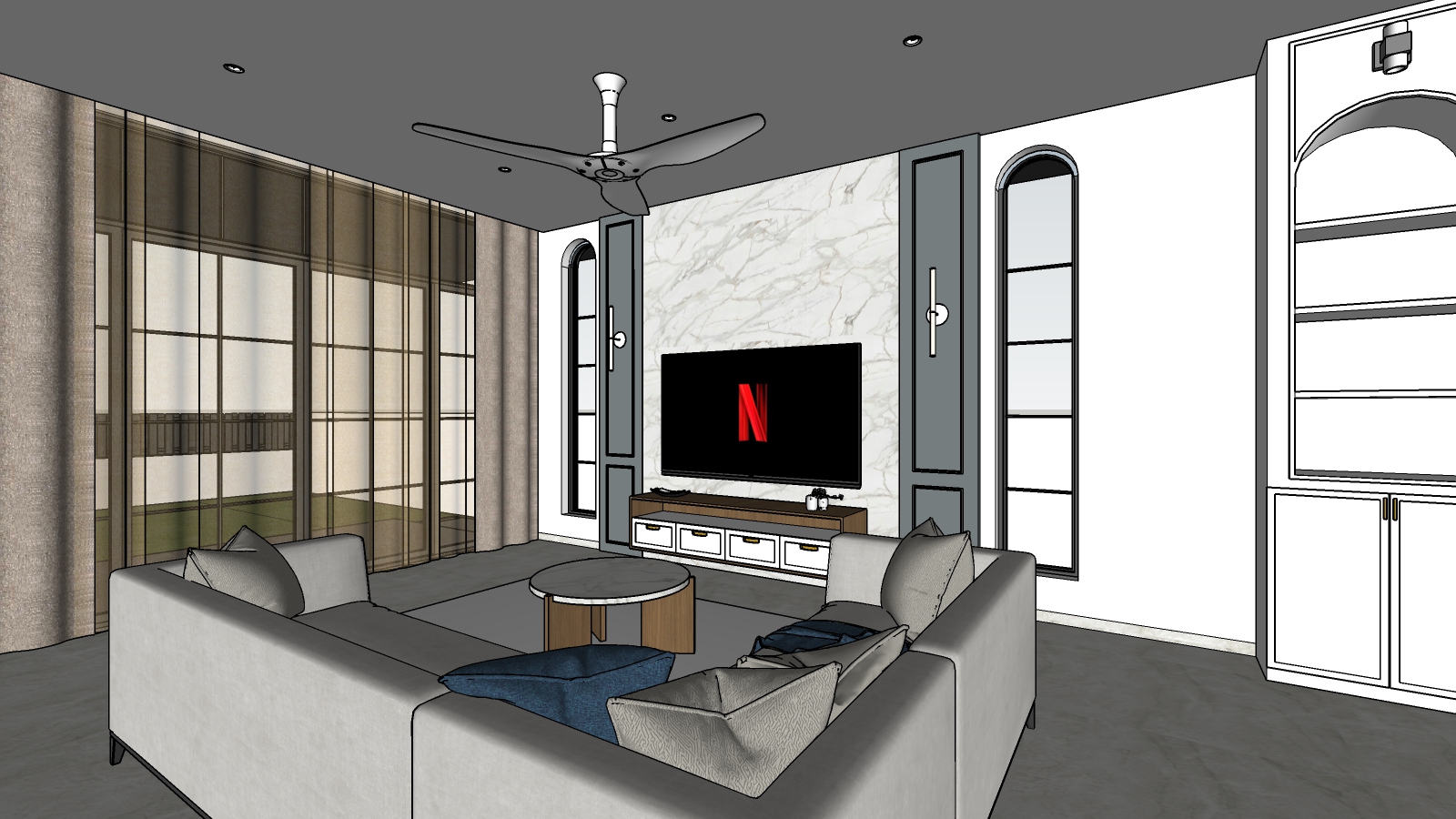 add some simple landscaping outside the doors and windows change the bookshelf on the right to be white in colour change the wall colours to be white change door and window frames to black