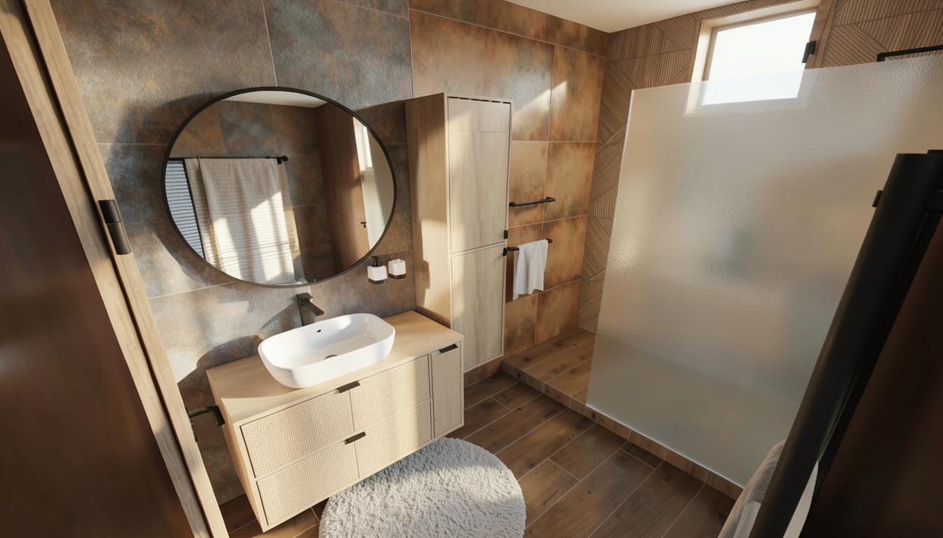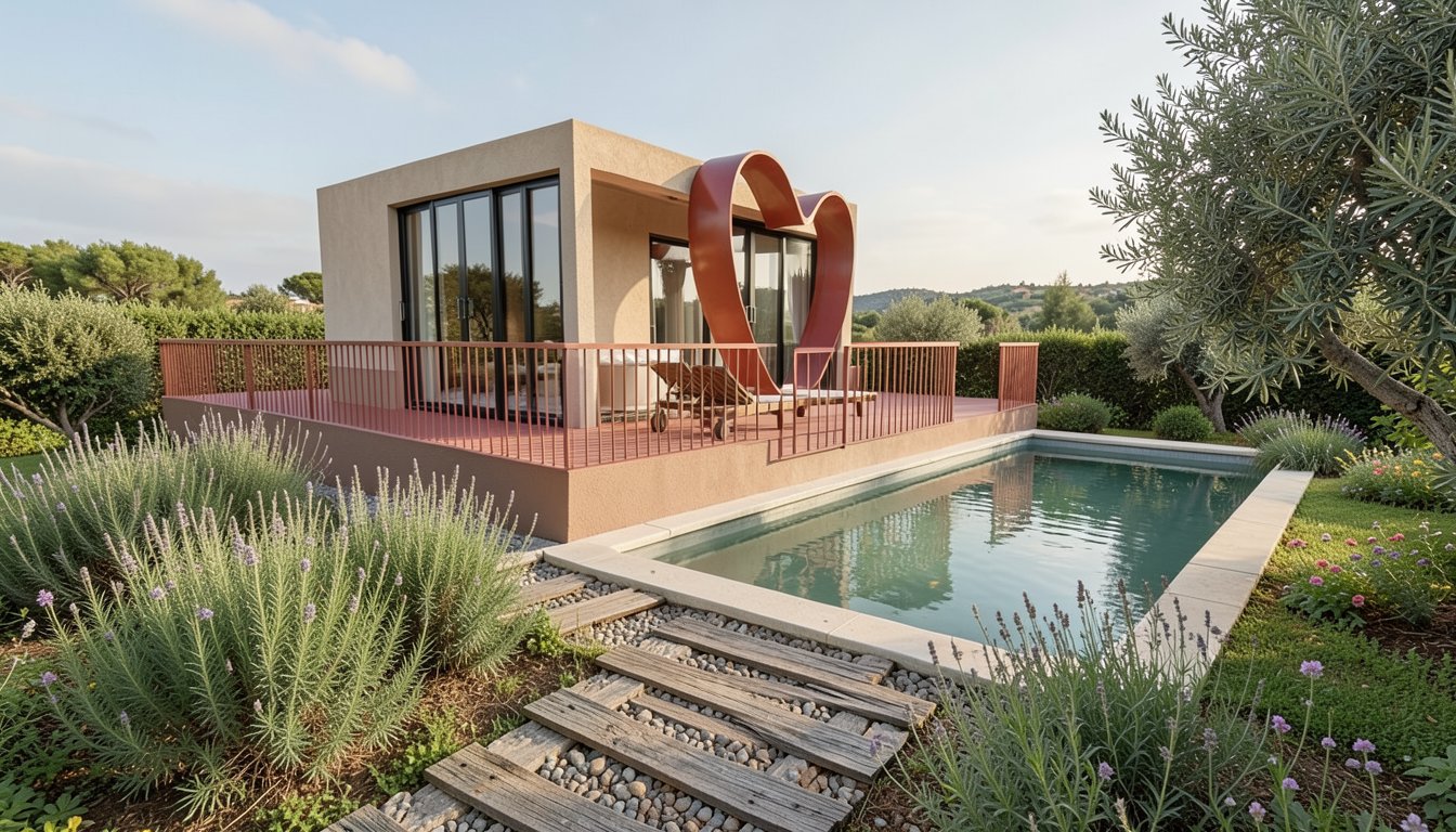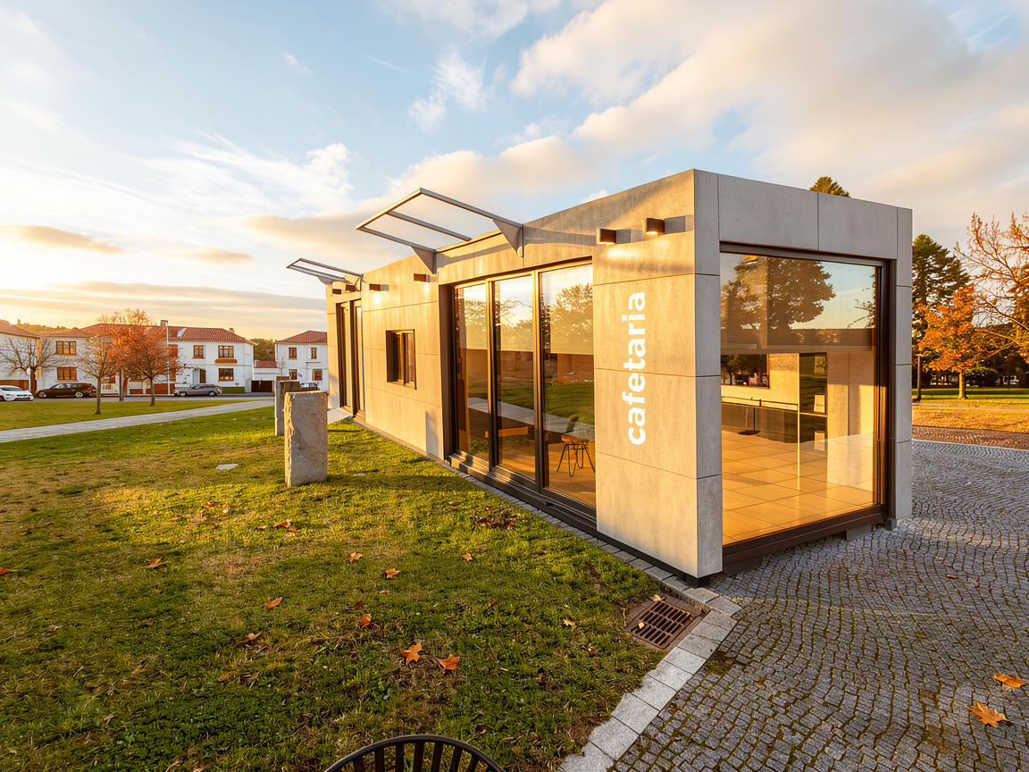 a futuristic floating platform on the ocean designed as a modern architectural studio the structure features sleek metallic surfaces solar panels glass walls and open decks overlooking the water the setting is during golden hour with warm sunlight reflecting off calm waves the design blends science fiction aesthetics with sustainable architecture elegant minimalistic and functional surrounding environment includes distant horizons and light ocean mist highly detailed and realistic render