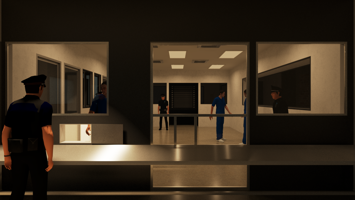 all the characters in the scene are male prisoners in a jail make the scene with dramatic lighting and materials