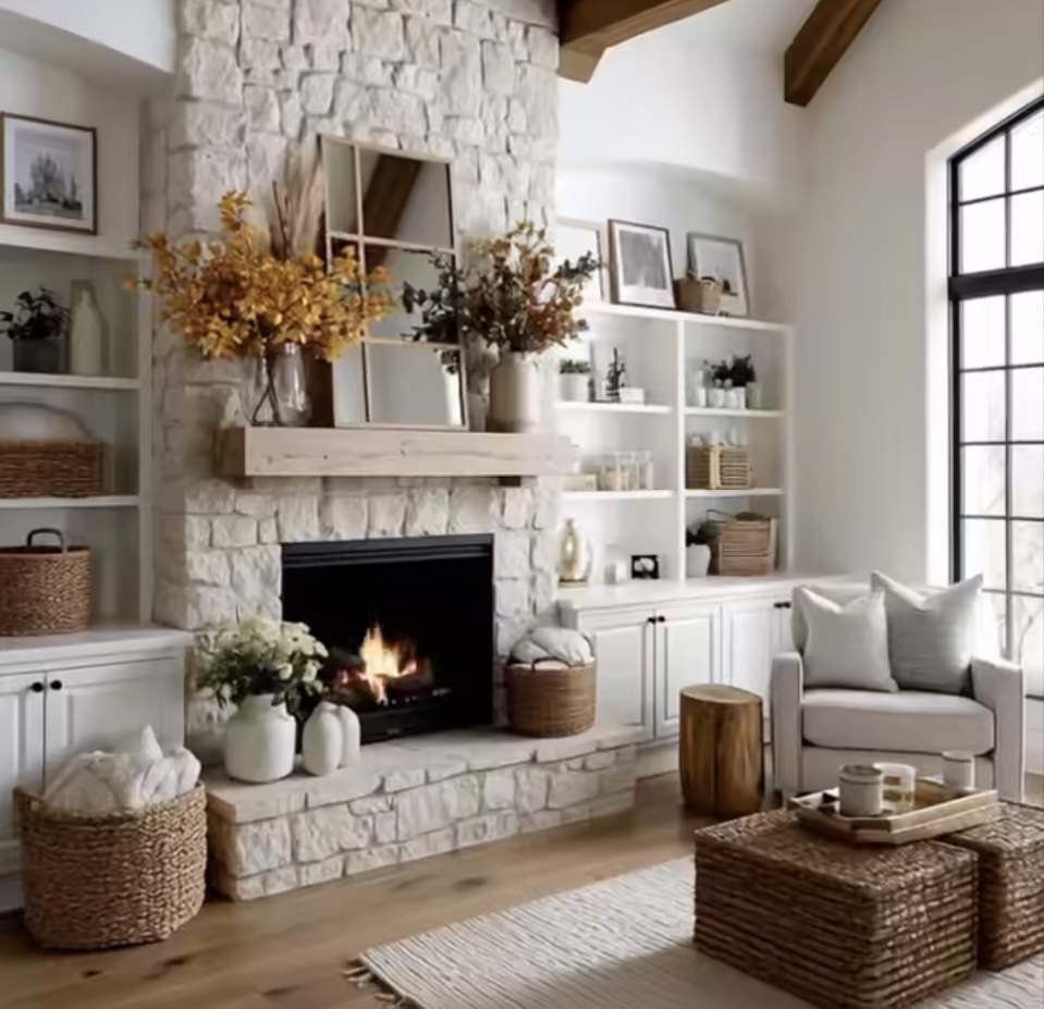 remove flowers off themantle make it more modern make all walls black change all floors to polished concrete