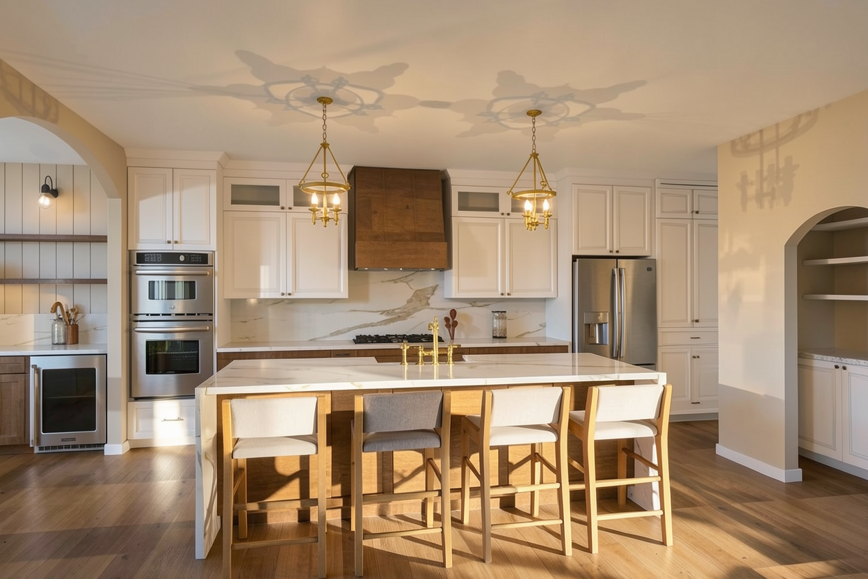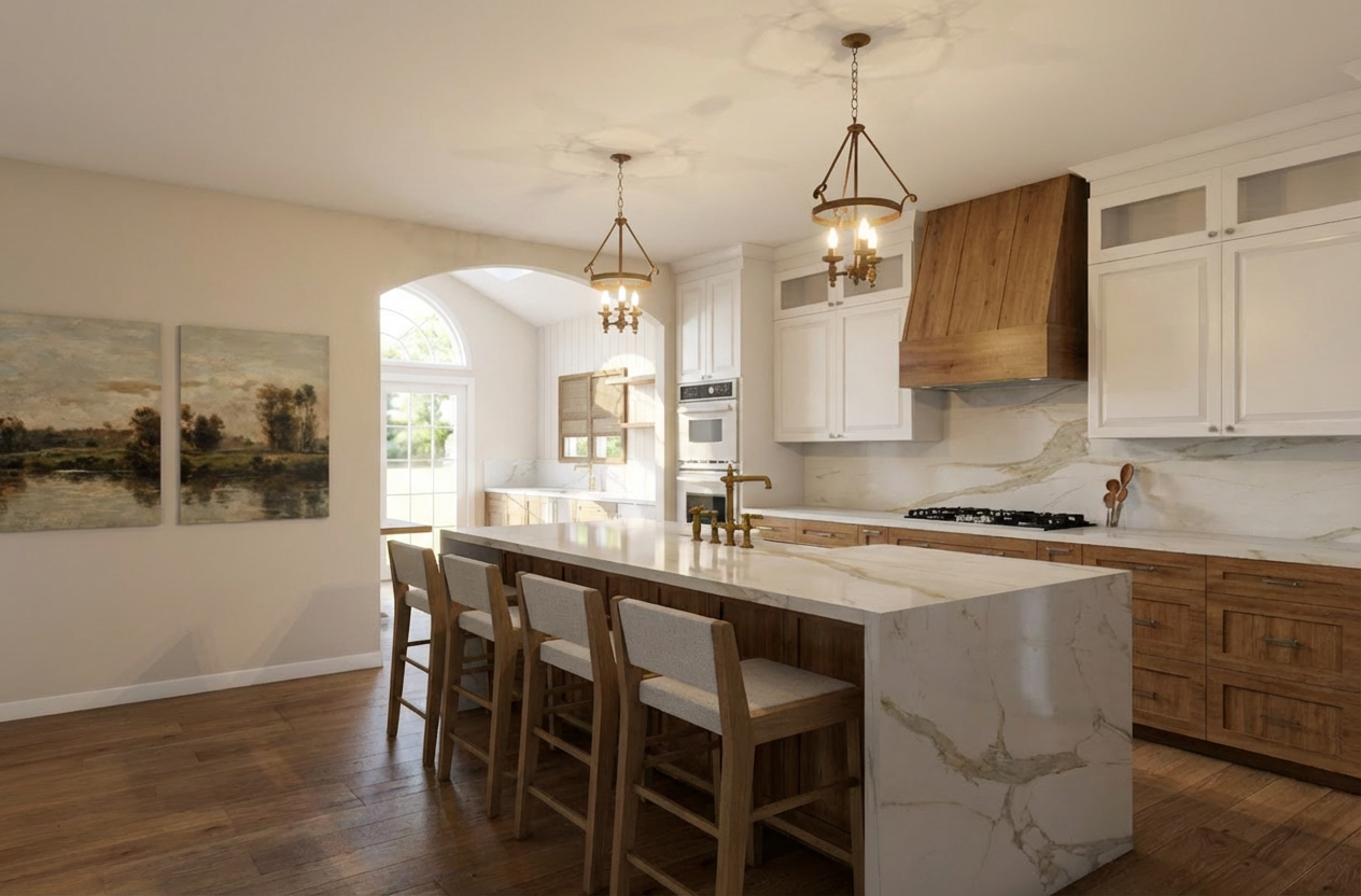 change the flooring to concrete lighten up the wood tones to match a white oak