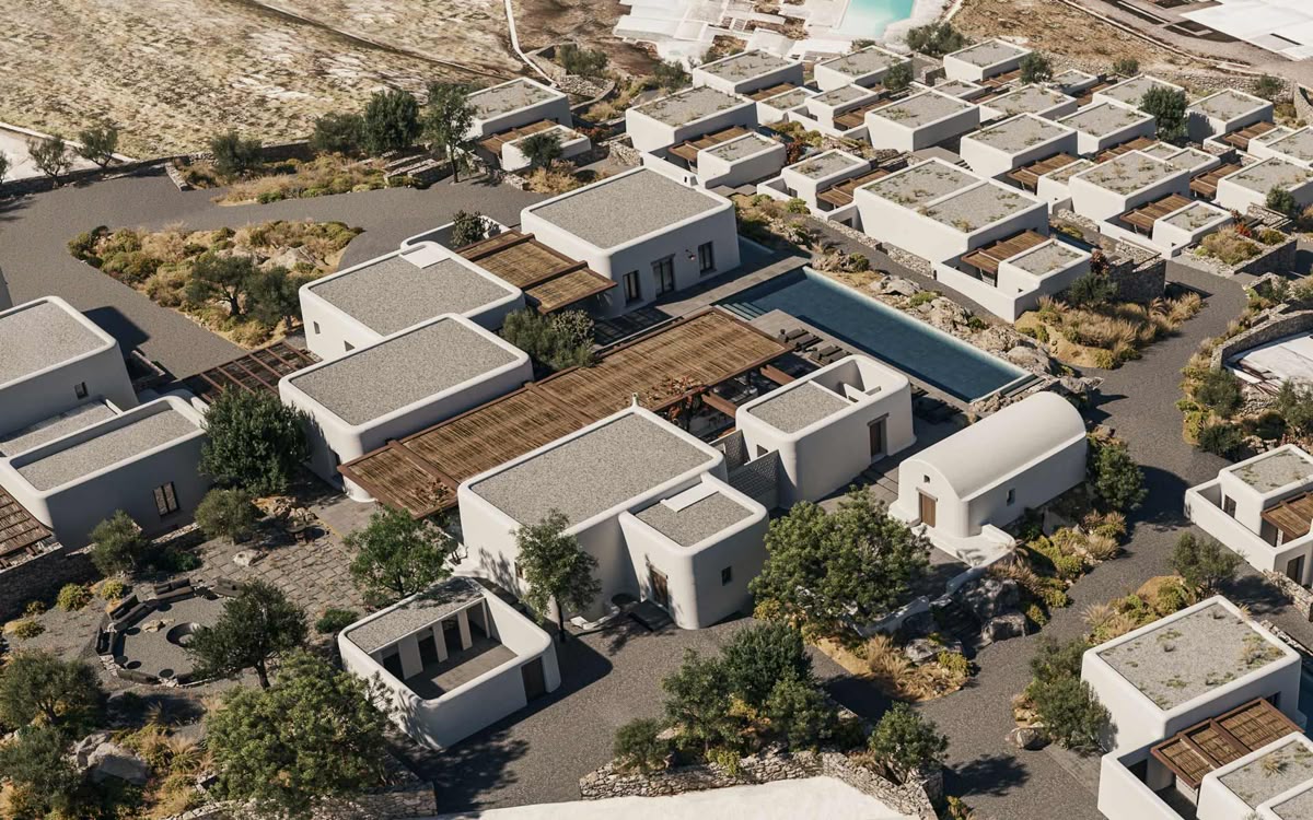 exterior shot aerial view of a serene coastal village with lush greenery and vibrant bougainvillea bushes the buildings have rustic terracotta roofs and beige walls situated beside a tranquil clear azure sea the shoreline features soft sandy beige tones where gentle waves kiss the shore the atmosphere is peaceful and idyllic capturing the warm golden glow of a sunny afternoon