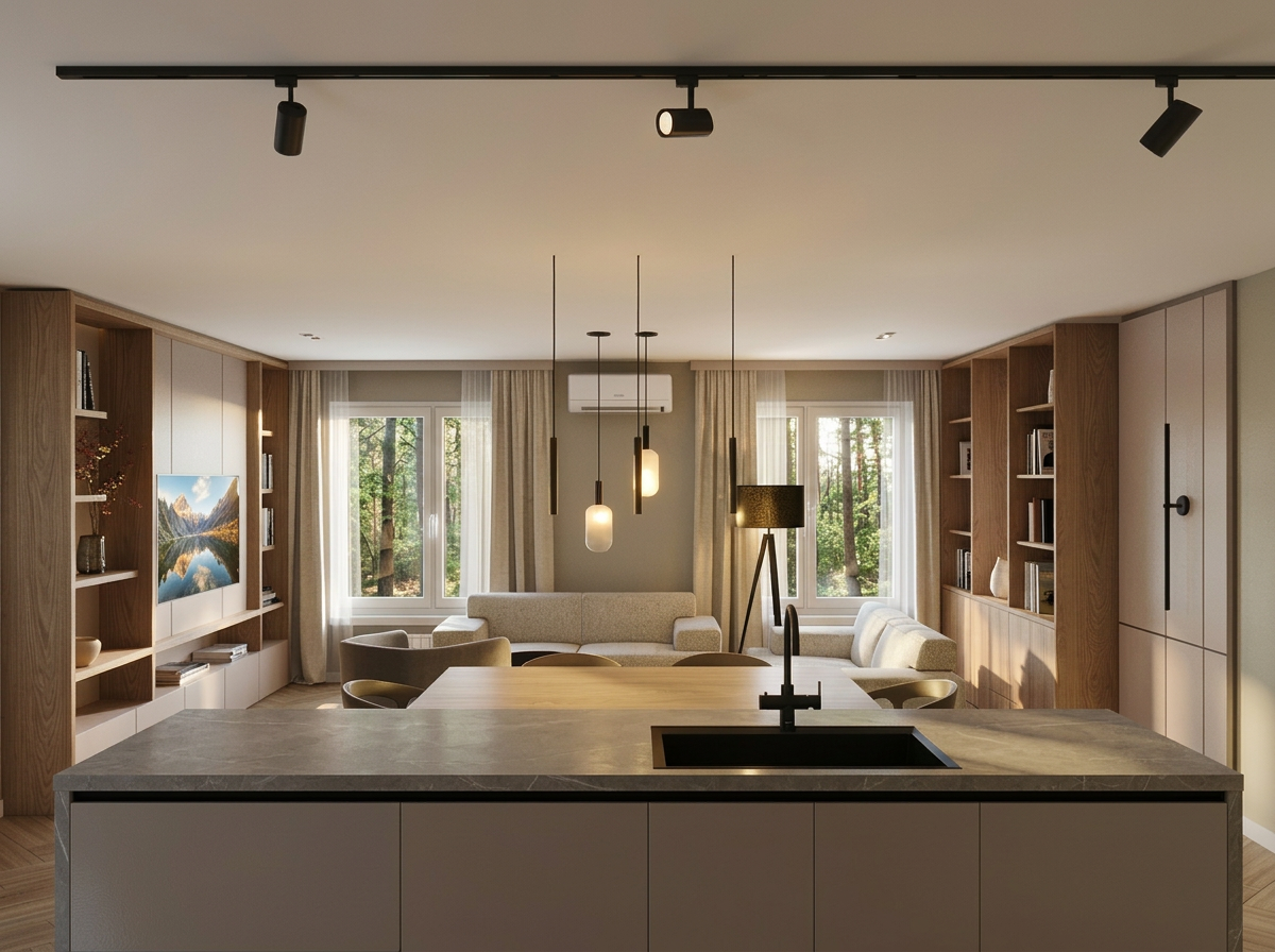 soffitto in cemento verniciato grigio chiaro top e schiena cucina bianco opaco strip led sotto i pensili cucina mantieni tubo rosso sprinkler a soffitto la prima anta dell armadio a sinistra in specchio mantieni gole cucina e armadio colorate verdi mantieni scocca sedia in plastica arancio legno e parquet in rovere no nodi no poster a parete arreda la stanza come uno studente universitario