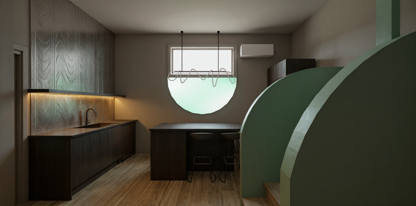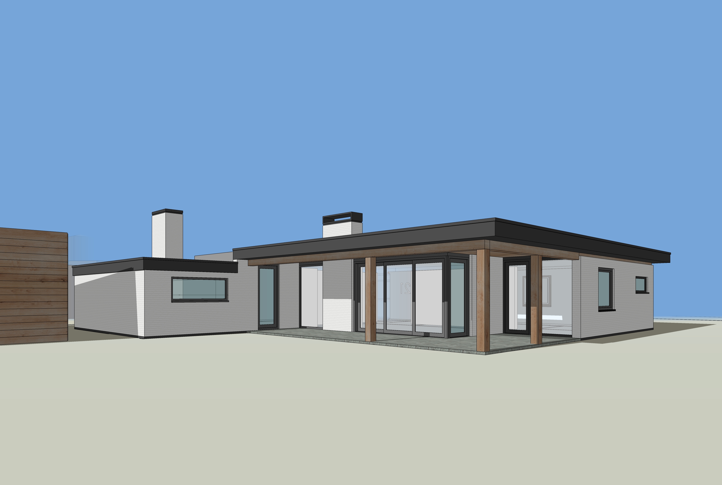 make it a vivid picture with a garden in the front and some trees behind the building and some people having fun in the garden on a sunny day