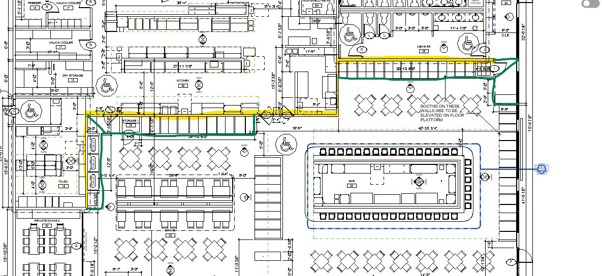 yellow lines show wall extending up to deck to be elevated green lines show outline of shed roof booth seating below this is a coastal restaurant provide sketch elevation of the yellow walls