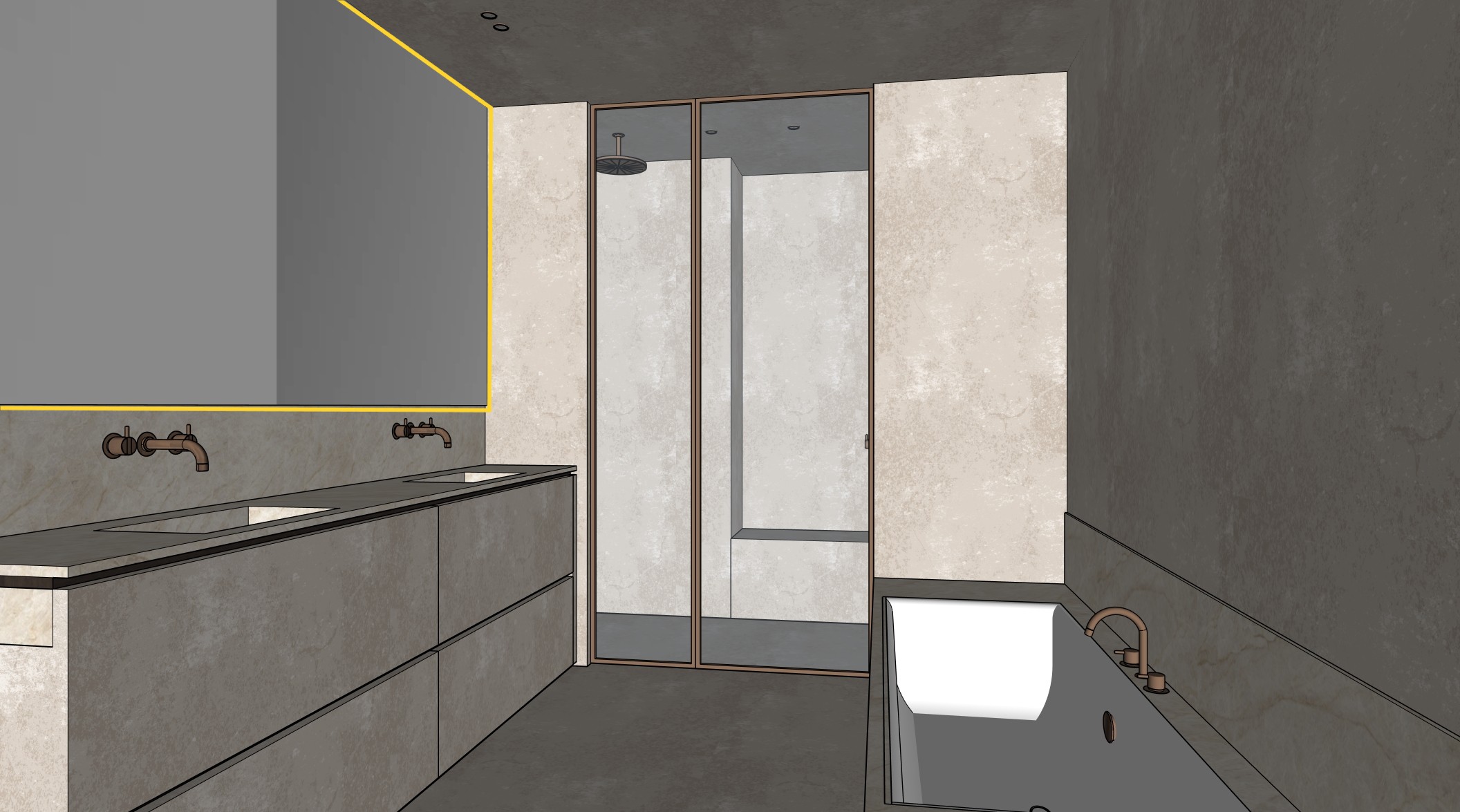 high end bathroom taj mahal soft plaster bronze fixtures inner window archsynth strict camera match maintain precision 4k photorealism pbr only no redesign no model changes create a 4k ultra photorealistic architectural interior render based strictly literally and only on the uploaded reference image this exact bathroom viewpoint this is an existing interior the reference image is authoritative and final all geometry layout proportions cabinetry bath glass walls door mirror fixtures and circulation must remain 100 identical to the reference image no redesign no reinterpretation no repositioning no added or removed elements no camera changes treat the image as a camera matched architectural backplate camera absolutely locked exact same camera position height and distance same framing and crop same perspective architectural lens 24 28 mm perfect verticals no distortion walls ceiling soft ton sur ton plaster critical walls and ceiling fully monolithic no seams joints or panel lines decorative soft mineral lime based plaster color softly blends with taj mahal quartzite warm beige ivory undertone slightly lighter than reference no cold greys no strong contrast matte not flat visible micro relief no concrete look no sharp color separation vanity cabinetry important clarification lower cabinets finished in the same plaster paint technique as the walls identical color and texture as wall plaster seamless finish no panel seams no stone on cabinet fronts handles greeplijsten in wood veneer seamless wood grain correct grain direction satin mat finish no metal handles no recessed grooves stone taj mahal quartzite mandatory applies to vanity countertop integrated sinks bathtub surround bathtub upstand wall cladding behind bathtub niche stone surfaces only properties taj mahal quartzite satin finish warm cream gold veining subtle reflections visible mineral depth shower glass inner window light glass frame in bronze glass door frame in bronze door handle in bronze shower head ceiling mounted water visibly running inner window very important the glass next to the shower is an interior window it does not receive daylight it provides a very subtle secondary light glow soft ambient spill only no directional sunlight no bright highlights glass reflections reflect neutral plaster wall only same color and texture as bathroom walls no exterior reflection no window shapes visible lighting shower area lit by ceiling spot only no led behind glass metal bronze locked applies to faucets shower fixtures bath filler glass frames door handle pendant cable ceiling connection finish warm bronze satin metal reflections subtle patina no chrome look mirror led yellow lines mirror size and position identical led integrated around mirror perimeter placement exactly as indicated color temperature 3500k indirect glow led source not visible led must clearly read as real led bathtub shape identical to reference taj mahal stone surround correct edge thickness water surface with realistic reflections soft ambient reflections floor textiles floor identical to reference beige fluffy bath mat semi high pile visible fibers orientation aligned with cabinetry accessories white slippers on mat natural fabric folds accessories one hand soap dispenser positioned between the two sinks minimal neutral design realistic material behavior lighting soft bright controlled primary light bright but diffuse ambient light no visible windows in frame no daylight from behind camera overall evenly lit scene low contrast secondary lighting ceiling spots on realistic light cones soft fall off color temperature 3500k supports ambient light only negative prompt daylight through inner window direct sunlight strong highlights flat plaster concrete look visible seams rounded corners stone cabinet fronts metal handles led behind glass mirrored reflections cinematic lighting high contrast blur haze fog bloom noise people clutter game engine look