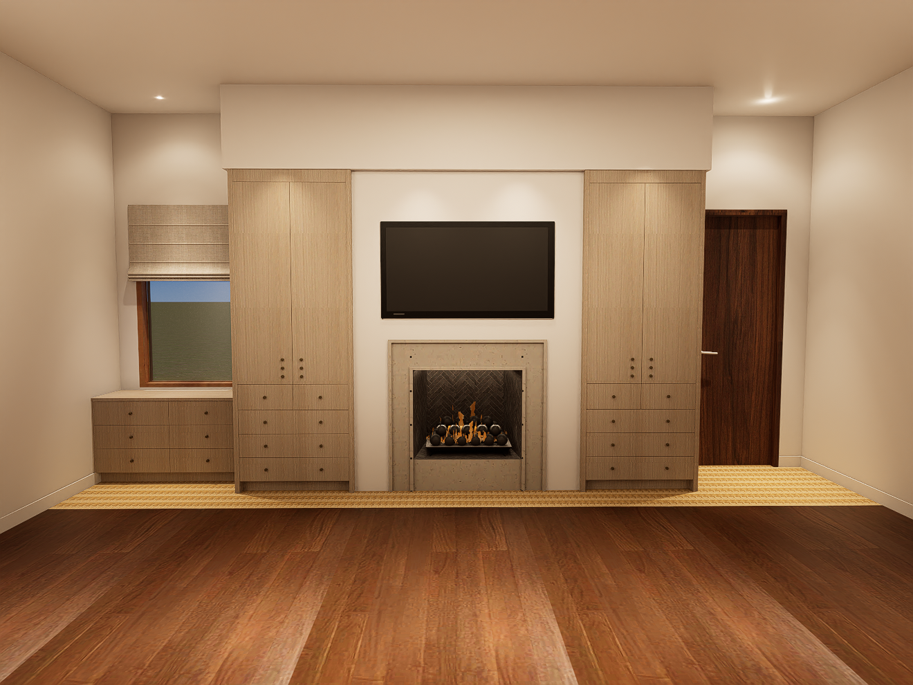 ultra realistic interior rendering of a warm contemporary primary bedroom feature wall with a centered fireplace and custom millwork symmetrical composition with floor to ceiling white oak cabinetry flanking a plaster fireplace surround cabinetry features vertical grain soft matte finish minimal black hardware and integrated drawers below a large flat screen tv is mounted above the fireplace perfectly aligned fireplace is finished in a soft hand troweled plaster with subtle tonal variation surrounding a firebox filled with matte black fire spheres interior firebox lining has a dark herringbone texture flames are natural gas low and ambient to the left a built in window bench with matching white oak cabinetry sits beneath a window with a textured roman shade in a warm neutral fabric to the right a flush wood door in a darker walnut tone adds contrast flooring is wide plank natural hardwood in a medium warm tone with visible grain and satin finish transition detail important where the cabinetry platform meets the wood flooring include a refined tile inlay strip using cl zellige baguette tile gloss finish with 24k gold glaze dimensions 2 x 6 x 3 4 laid in a linear pattern as a decorative threshold band tile should feel handcrafted with slight variation subtle reflectivity and imperfect edges catching light naturally lighting is soft indirect and architectural recessed ceiling lights with warm 2700k temperature gentle wall wash enhancing plaster texture subtle under cabinet shadowing for depth style should feel elevated editorial and timeless architectural digest aesthetic highly detailed materials realistic imperfections accurate light bounce soft shadows and natural color grading camera straight on elevation eye level 35 50mm lens rendering quality ultra realism ray traced lighting global illumination soft reflections micro texture detail