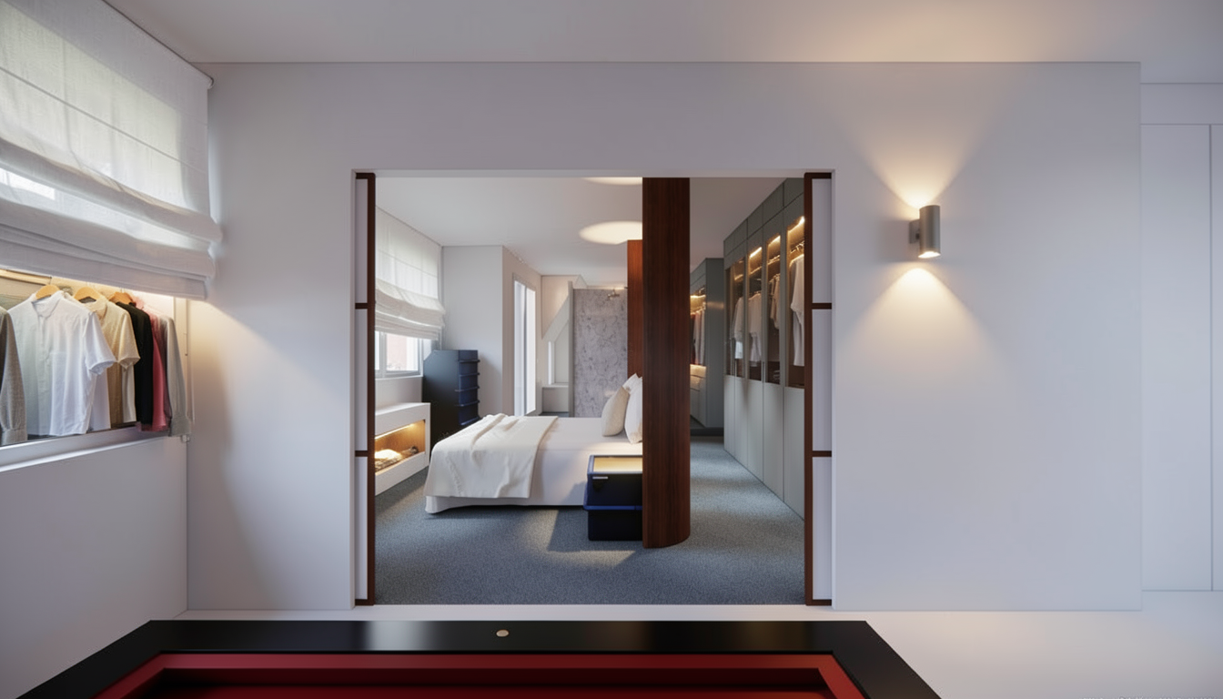 its summer afternoon outside add darker color trees outside behind the windows leave curtains closed but make them translucent turn on the wall light make it dimmed and in the color of k3000 and add a man in his forties wtaning infront of the window and looking outside blurred out