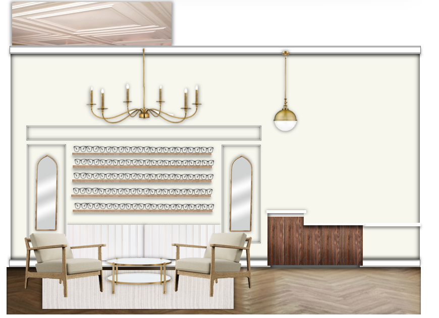 a cozy elegant reception area the room is painted in soft cream tones creating a warm atmosphere a side view of a curved reception desk is placed next to two plush beige armchairs with wooden frames face a sleek glass coffee table with a gold finish behind them a refined wall display features rows of delicate eyegasses on a light woof floating shelving harmonizing with the neutral palette flanking the display are two tall arched mirrors reflecting light gracefully above a vintage style chandelier with a brushed gold finish adds a touch of sophistication alongside a single matching pendant light the floor is a herringbone pattern of warm wood enhancing the room s classy inviting vibe