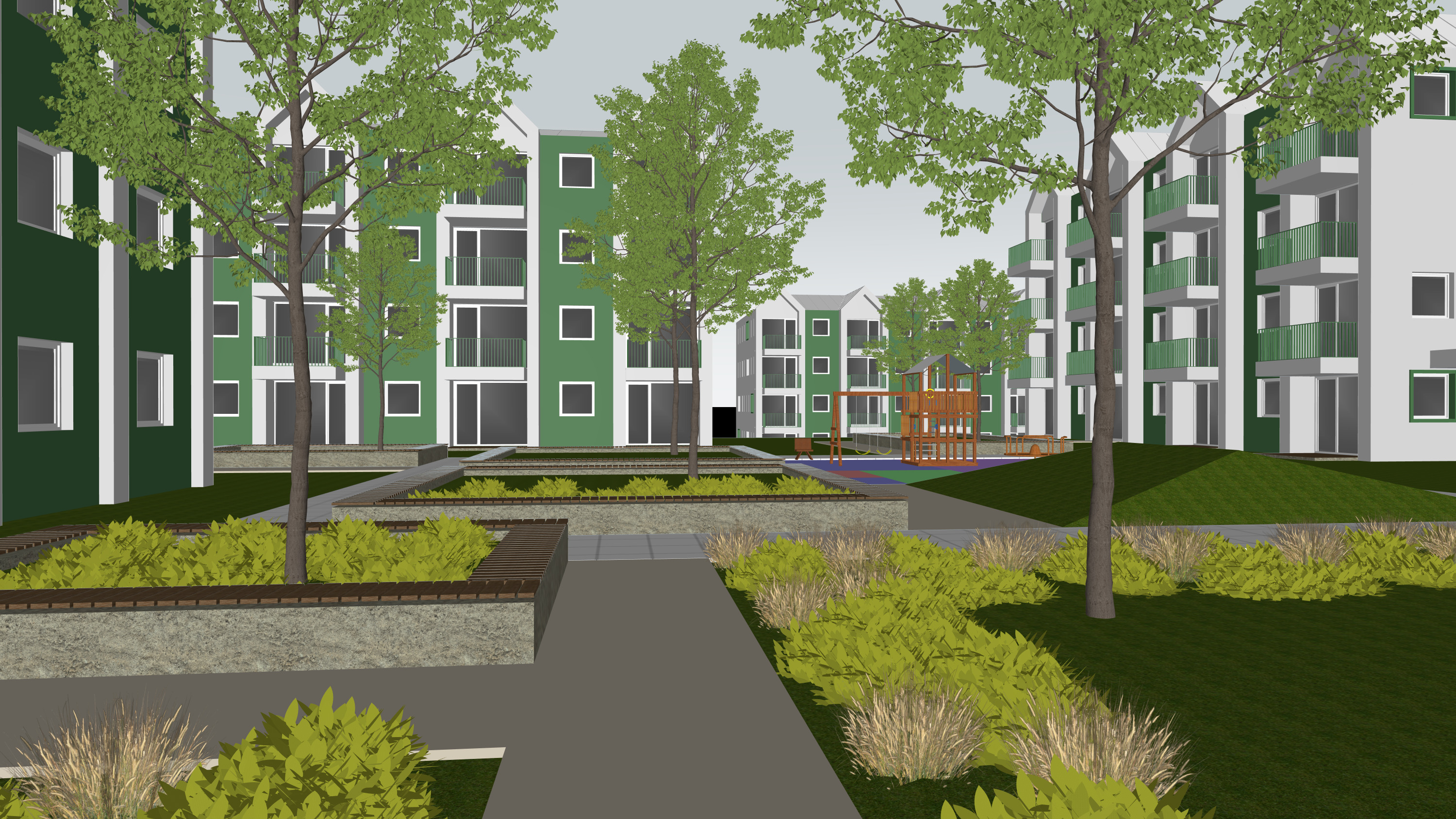 a modern residential complex with four story buildings featuring white and light green facades accented by dark green balconies the setting includes a neatly manicured lawn in rich green hues bordered by pathways in soft gray patches of yellow ornamental grasses and vibrant shrubbery are neatly arranged in planters made of weathered stone the sky is a calming gradient of light gray to pale blue creating a serene and harmonious atmosphere the overall ambiance is peaceful urban and contemporary with an inviting and well maintained landscape add people to the scene in the first plan on the balconies and childrean at a playground