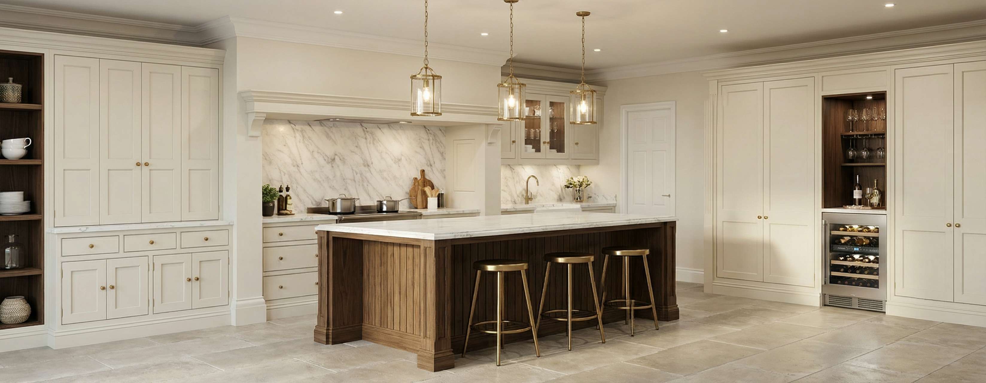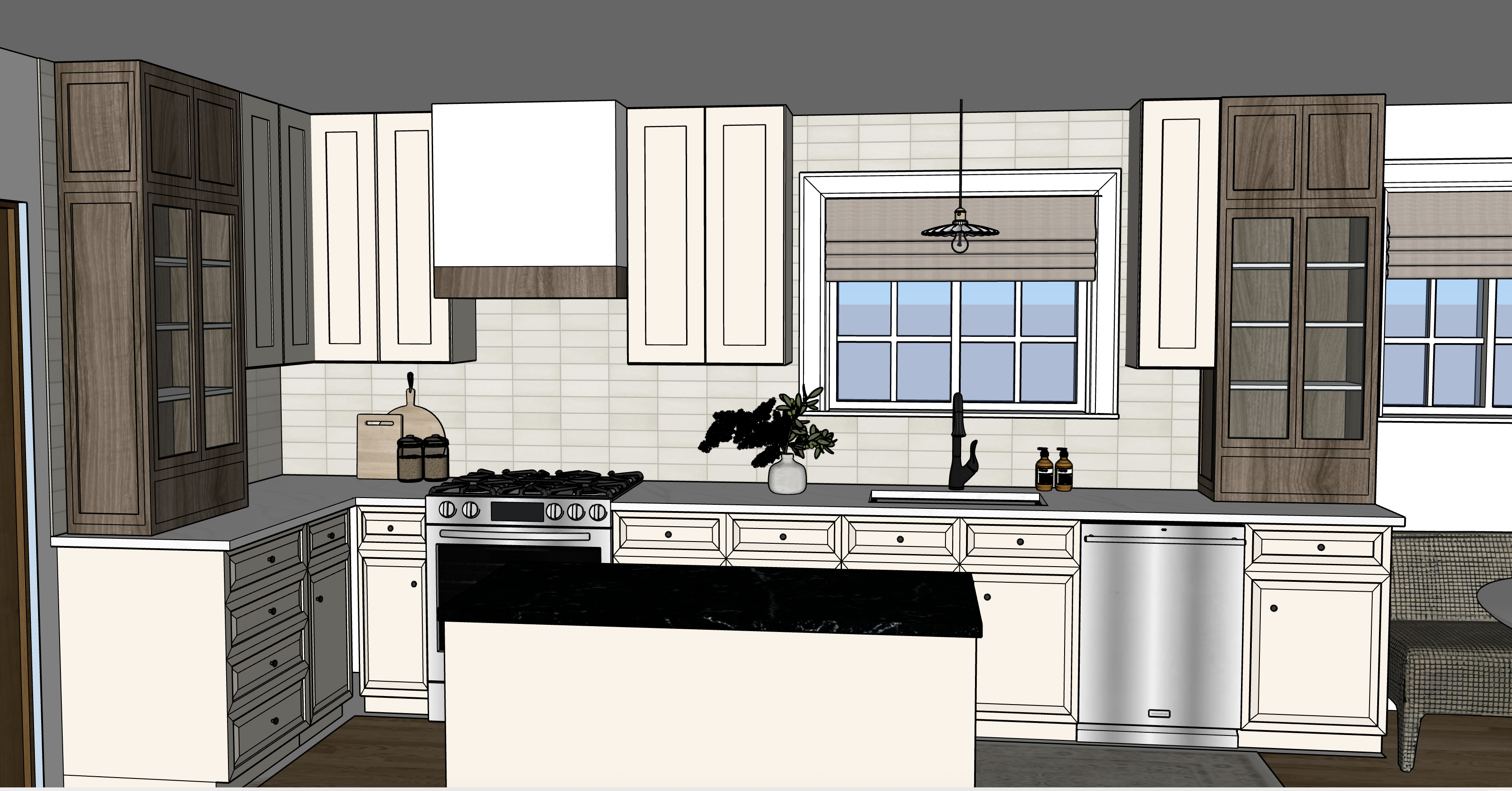 make the counters against the wall a white quartz with subtle grey veining and keep the island stone black as is lighten the walnut tone on the two tall wood cabinets and make the light more natural sunlight