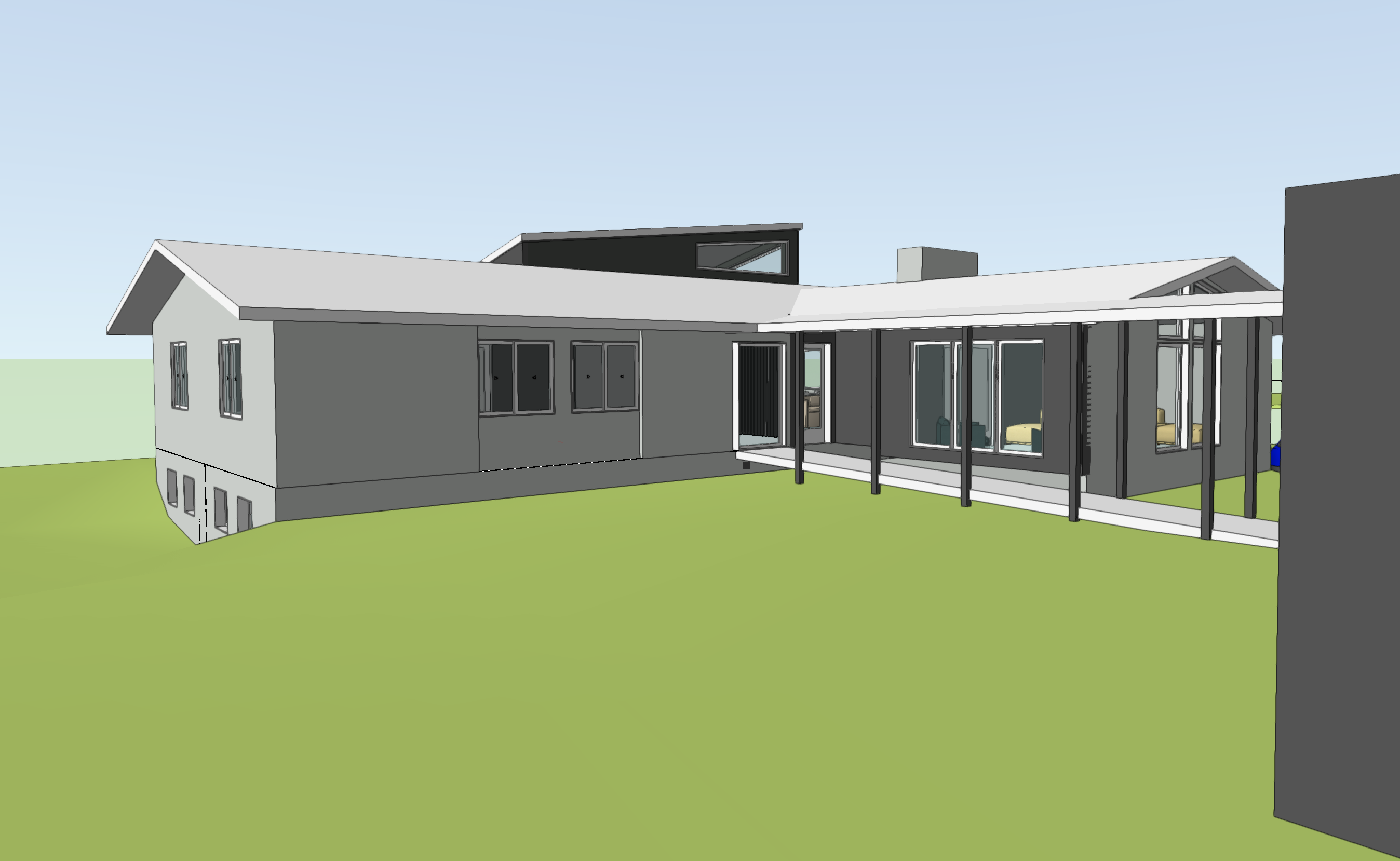 vertical wood slat siding the covered walk should be like a japanese engawa black asphalt roof shingles create a japanese garden in front of entrance along length of entrance ramp with gravel and plants do not create new walkways do not add stone anywhere else black windows warm sun foreground building is garage with similar wood slat siding chimney is stone do not change perspective do not change massing do not add roof to garage add some trees in background do not change perspective of image