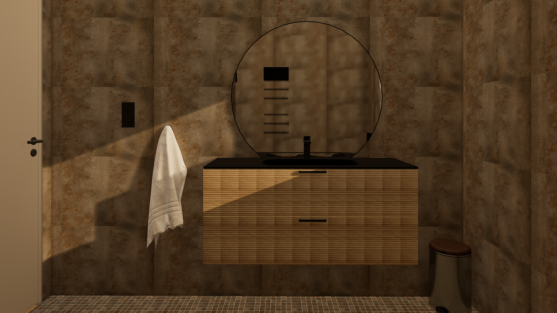 i only want editing of the mirror in this image what i want is for the reflection in the mirror to be replaced so that only the tiles from the wall next to it are reflected you can use the tiles on the side of the mirror and on the wall as the basis for the reflection so that it appears clean and realistic also add a light comming from the back of the mirror