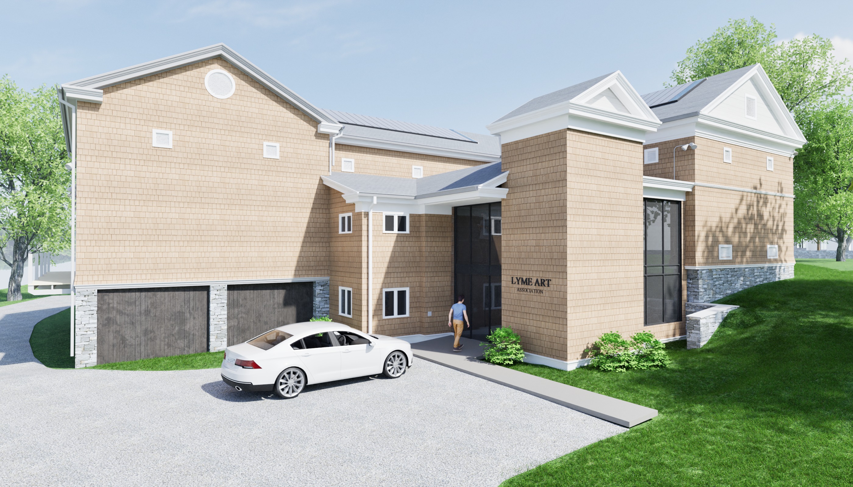 make this render more realistic the sky should be filled with some puffy white clouds the walls are clad in a light wood shingle the roof is a dark shingle the tone of the render should be warmer