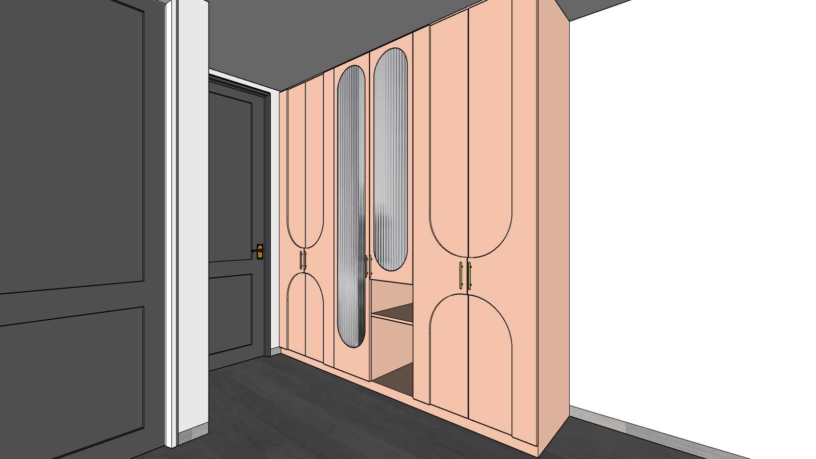 add laundry basket in the open compartment change the grey doors to white classic paneled doors