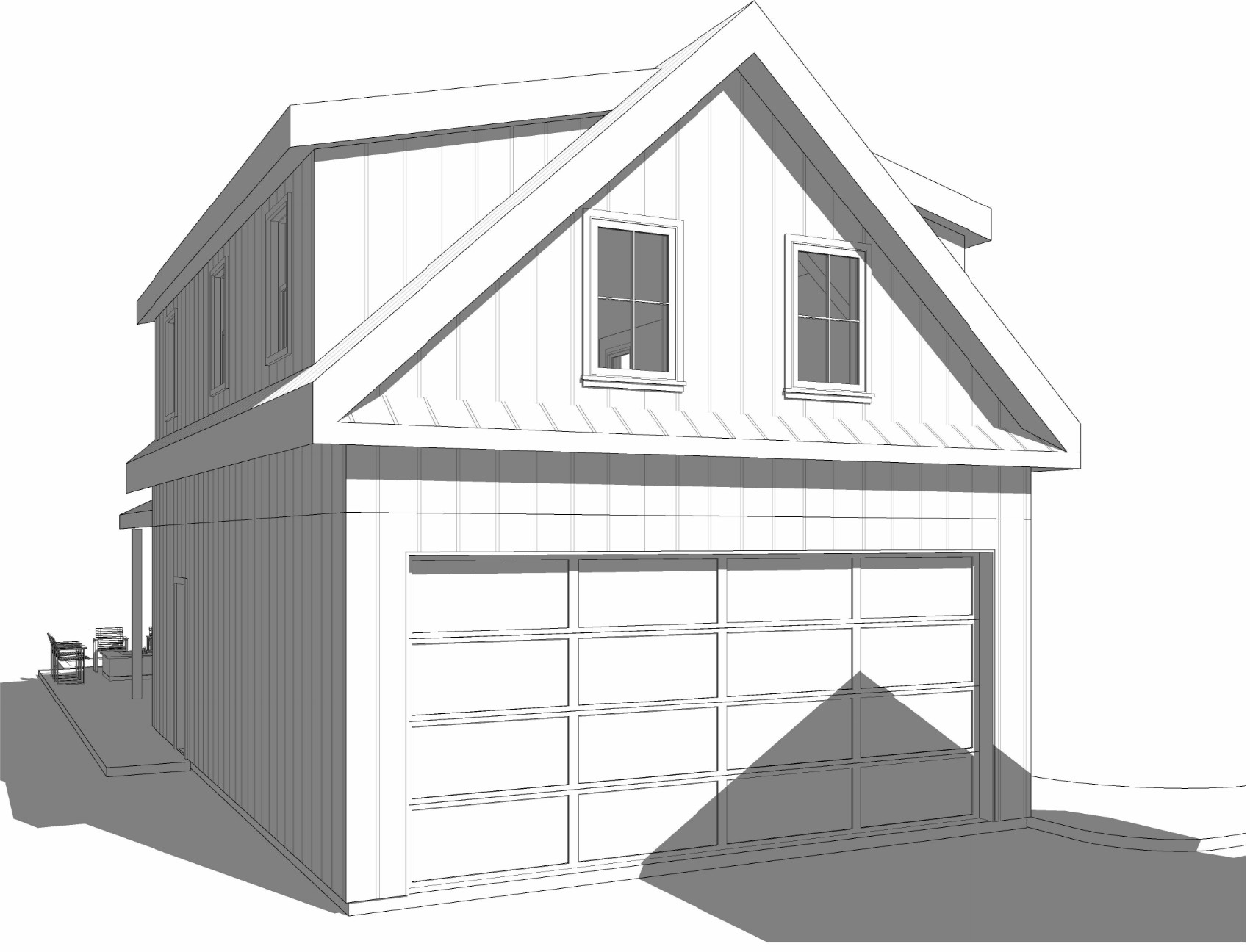 a detailed wide angle photograph of a custom modern farmhouse the exterior features crisp white vertical board and batten siding contrasted with black framed windows make sure to include the black framed windows also and a dark grey metal standing seam roof large overhead wood garage doors crafted from warm cedar detailed with black iron strap hinges and handles above each carriage door is a modern black gooseneck barn light a wide driveway leads up to the carriage house garage door bordered by lush green landscaping hydrangeas and ornamental grasses the setting is golden hour with soft warm sunlight illuminating the facade against a backdrop of mature trees and a clear blue sky do not change any windows doors porches dormers overhangs roof locations and do not change the view make the image as hyperrealist as possible