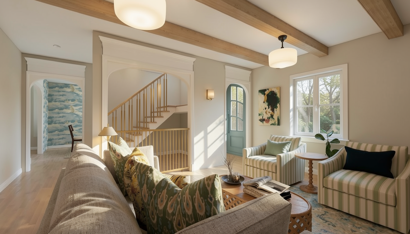 modern scandinavian style premium open plan living kitchen dining room interior with large glass surfaces the front door is solid black and garden view light grey polished concrete floor coffered very light oak ceiling panels the front door is solid black according to the original plan a matte black minimalist kitchen with light oak worktops a kitchen island grey fabric sofas clean modern furniture and plants bright atmosphere all wood is very light oak warm atmospheric lighting with recessed and spotlights strong natural lighting ultra realistic extra high quality rendering photorealistic lighting global illumination soft shadows cinematic interior 8k resolution