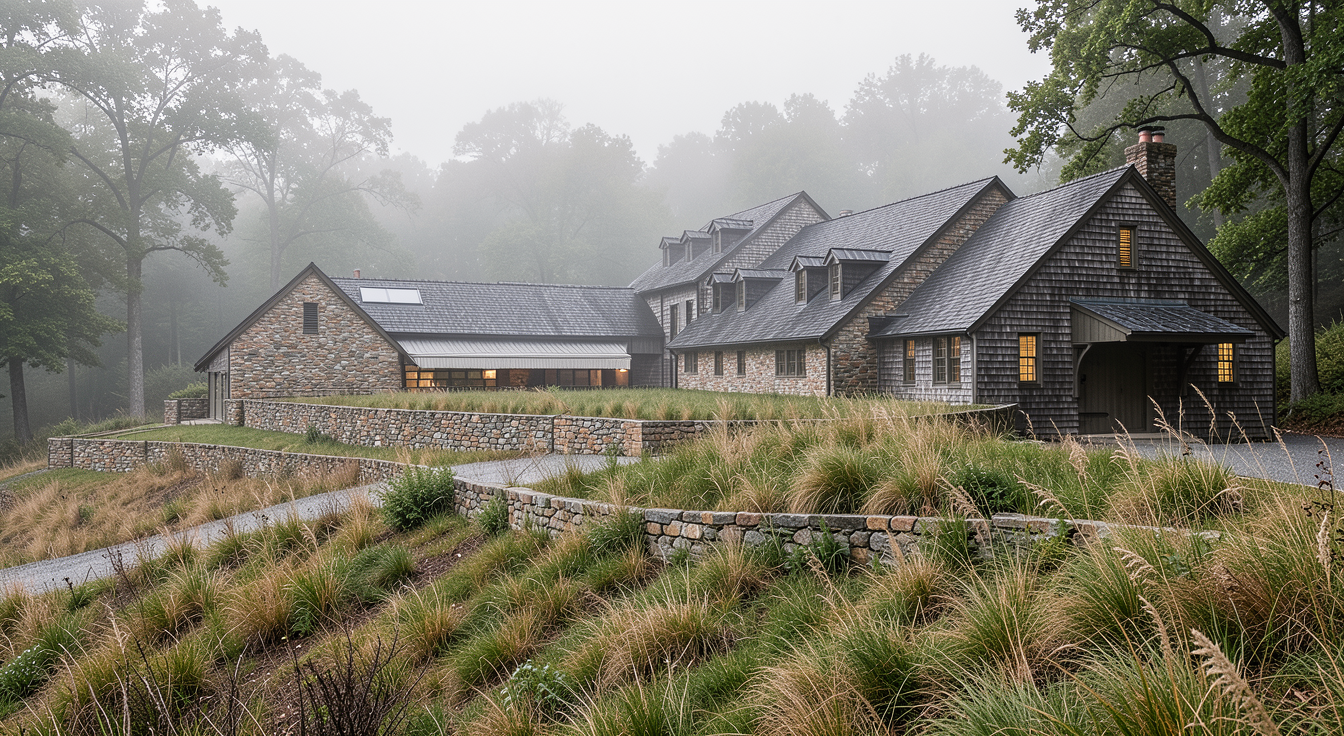 industrial design stone farmhouse set into the hillside vertical shiplap mill house metal bridge with small river under buildings in hillside with tall grass fog trees in background